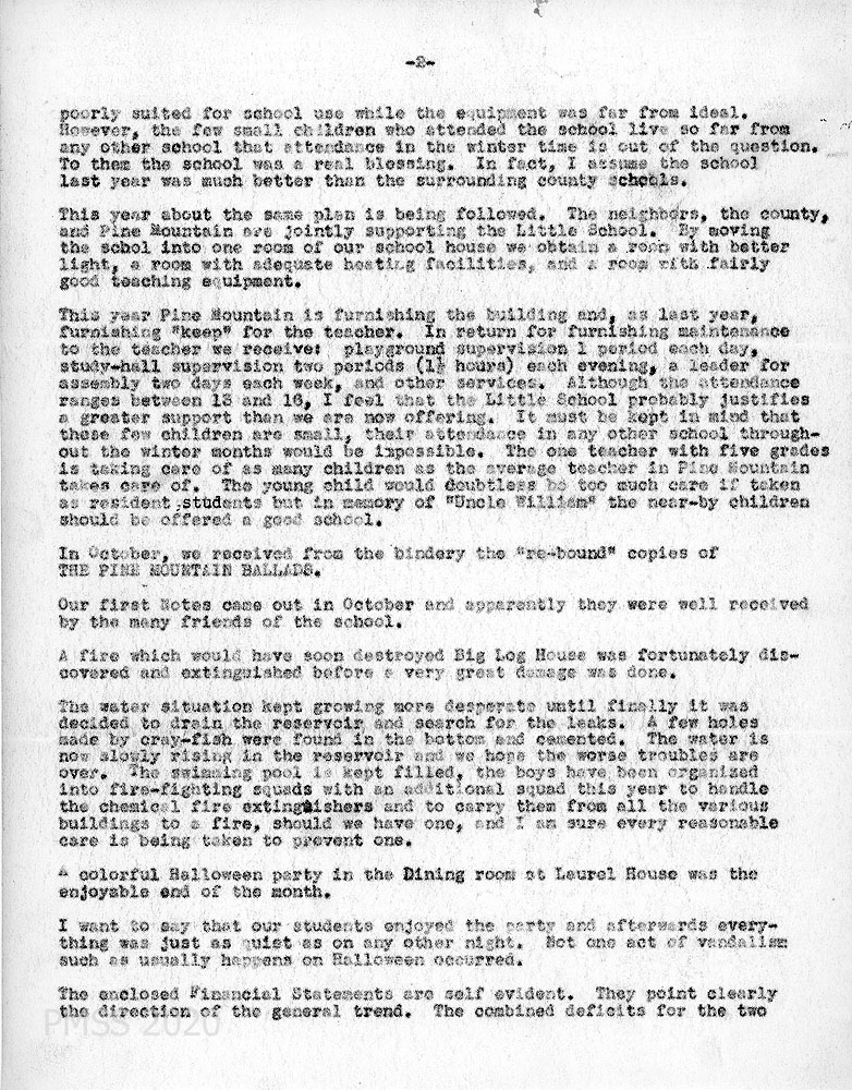 Sept 002 (Page 2) Little School, continued; (October) receipt of “re-bound” The Pine Mountain Ballads from the bindery; October NOTES; draining of the reservoir to search for leaks; swimming pool; student fire-fighting squads; Halloween party; enclosed Financial Statements;