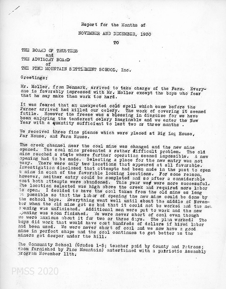 Nov 001 (Page 1) November and December 1930. Two-page report for the months of November and December 1930 to the Board of Trustees and the Advisory Board from Hubert Hadley, Director, concerning the following: Mr. [Peder] Moller arrived from Denmark to oversee the Farm; the cold spell resulted in tender celery; three pianos were placed in Big Log House, Far House, and Farm House; use of old coal mine and opening a new one; the Community School (grades 1-5) gave a patriotic assembly program on November 11;