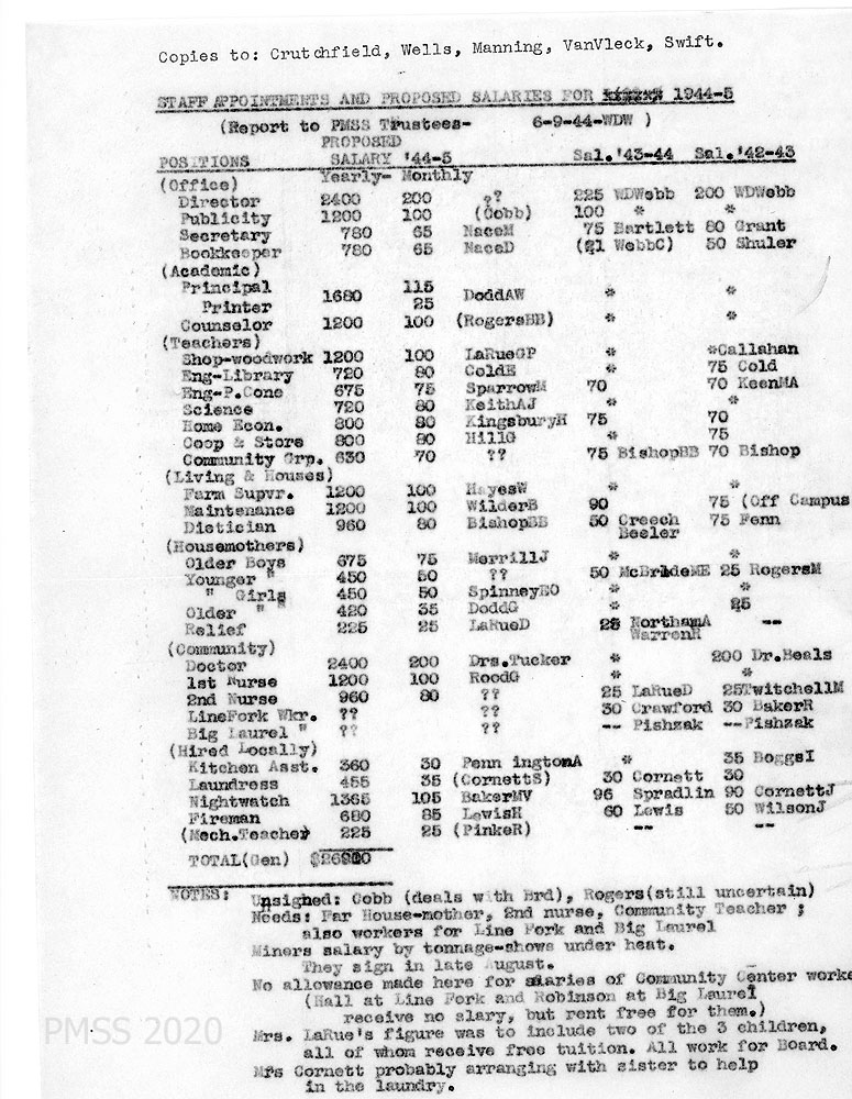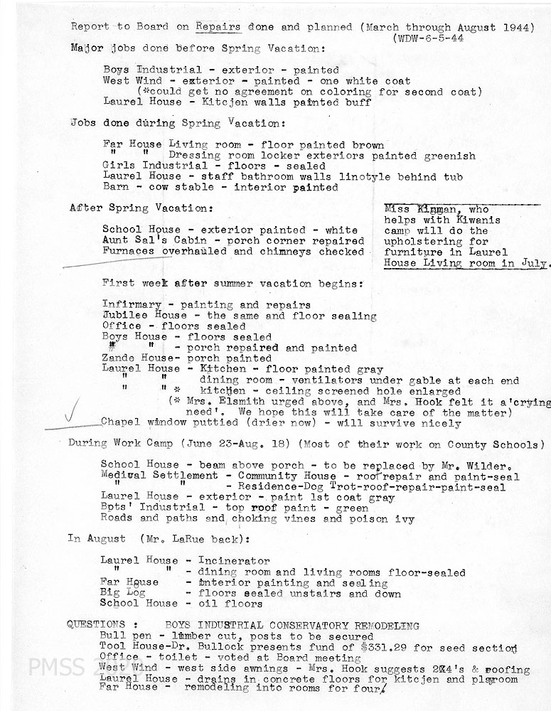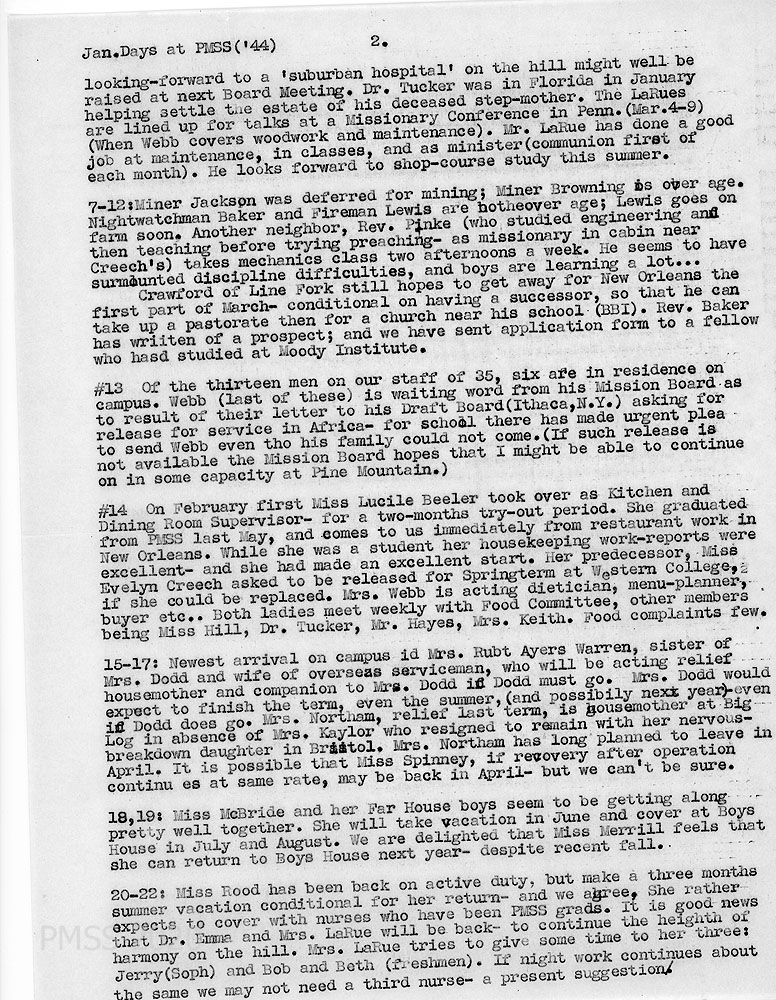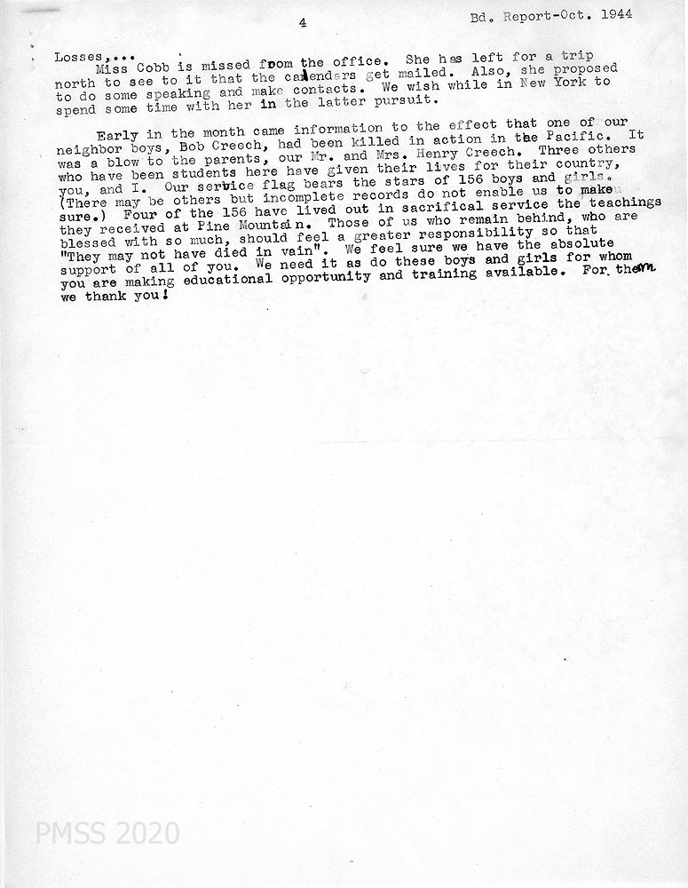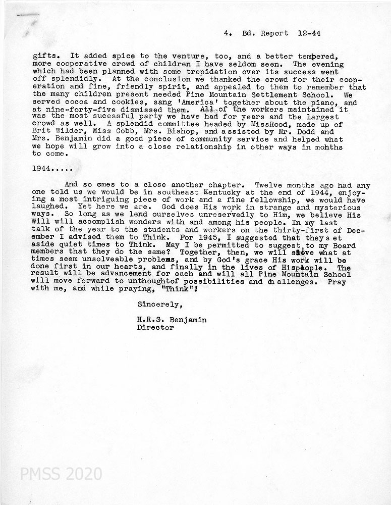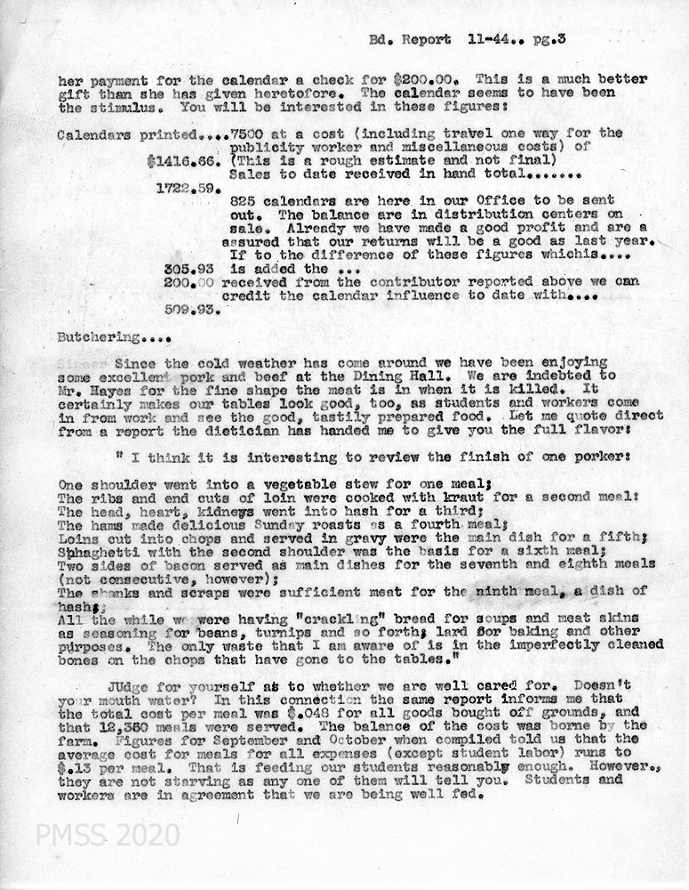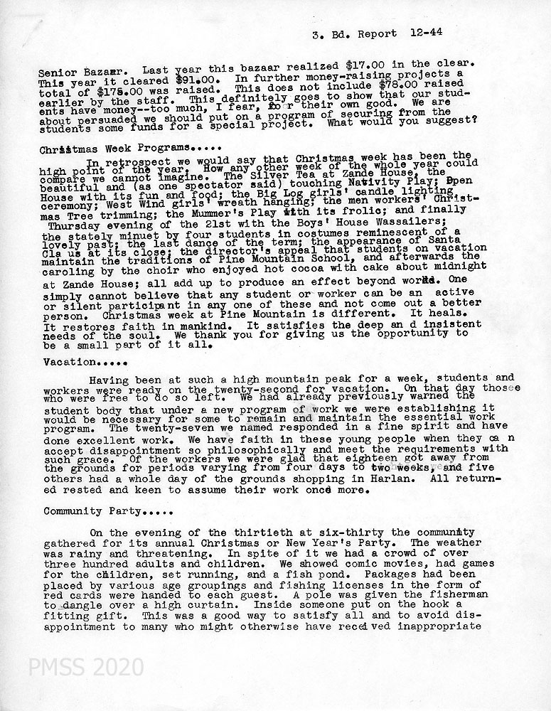 TAGS: Governance, 1944 Directors Reports and Letters to BOT, WWII, PMSS Board of Trustees, William D. Webb, H.R.S. Benjamin, draft status, PMSS staff, students, visitors, Defense Ball, country dancing, staffing updates, camps at PMSS, department reports, holiday celebrations, plays, donations, health care, building repairs, budgets, community, Fair Day, Line Fork Medical Settlement, religious activities, 1944 Calendar