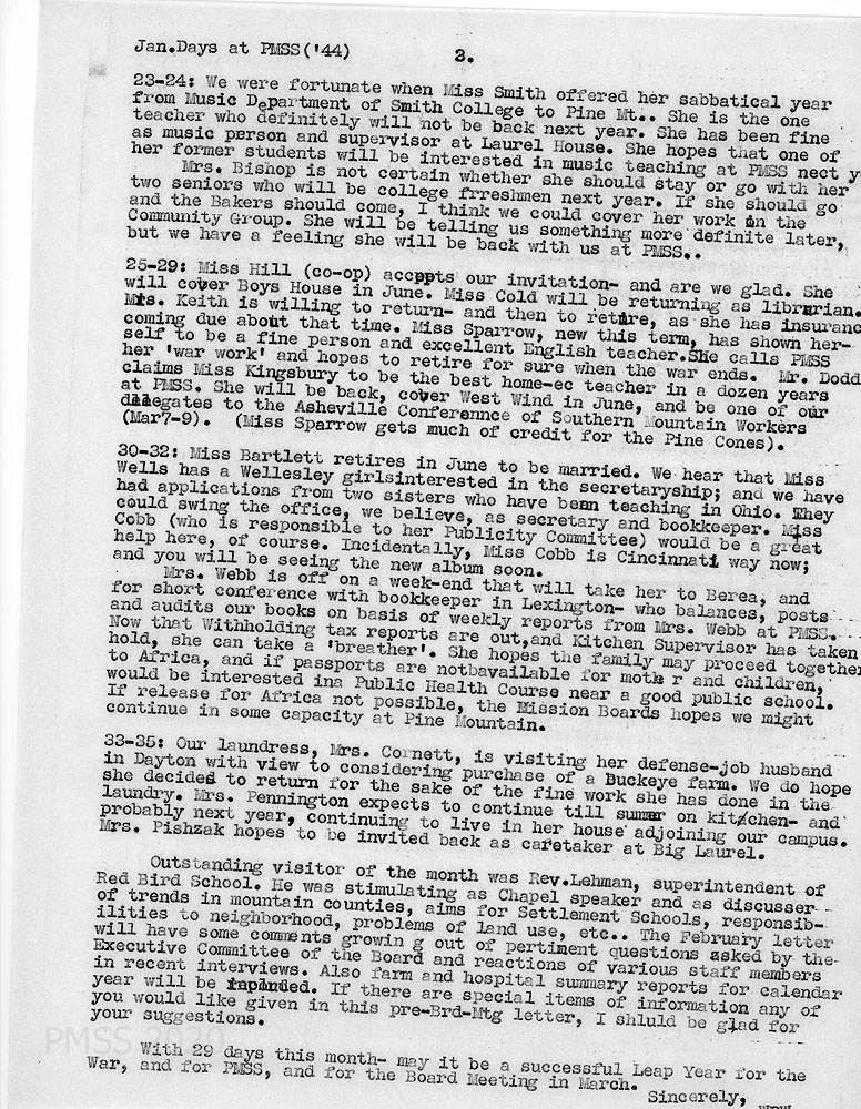 #30-32 …Miss [Helen] Bartlett, applicants for PMSS positions, Miss Alice Cobb, Mrs. Webb…#33-35 Mrs. Cornett, Mrs. Pennington, Mrs. [Anna Wulf] Pishzak. Visitors included Rev. Lehman, superintendent of Red Bird School, was a Chapel speaker. Subjects for upcoming February letter. Closing statement. Sincerely, [truncated].