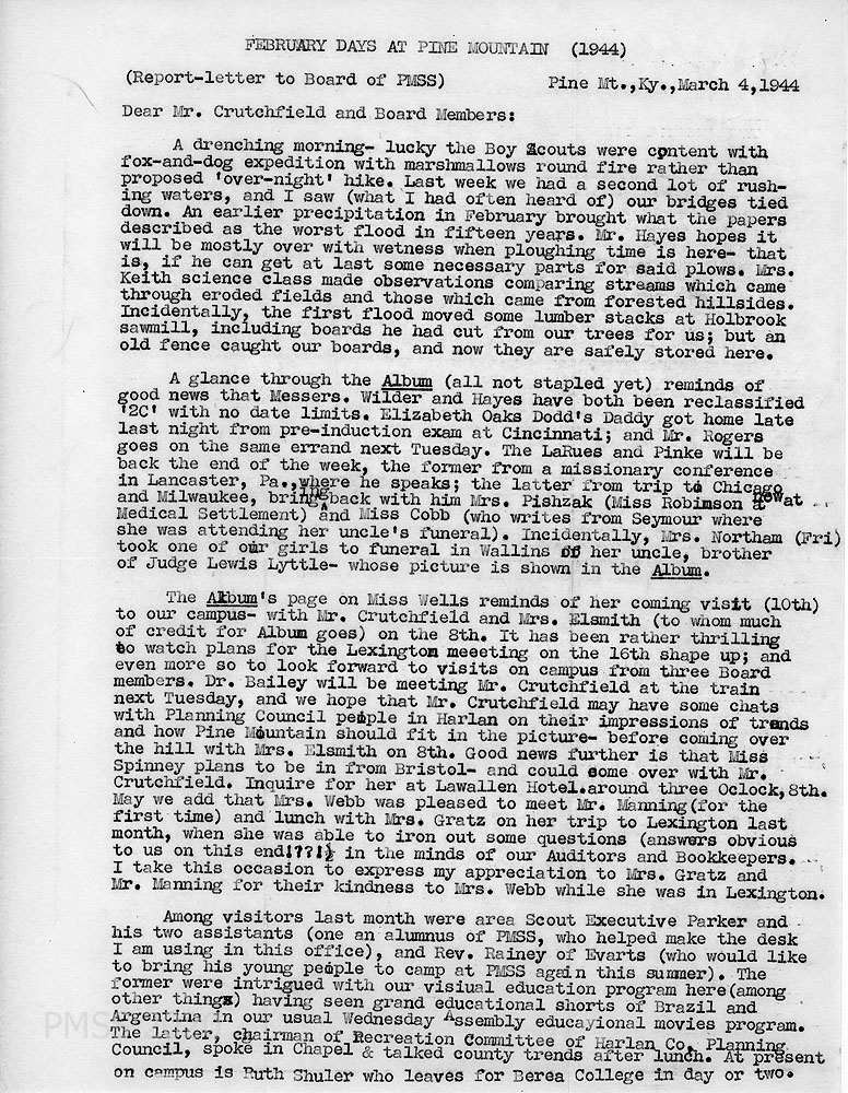 [004-Feb] “FEBRUARY DAYS AT PINE MOUNTAIN (1944) (Report-letter to Board of PMSS), Pine Mt., Ky., March 4, 1944. Dear Mr. Crutchfield and Board Members:” Describes the rainy weather, flooding, tying down the bridges; Mentions Mr. Hayes’ concerns; and Mrs. Keith’s science class studying the streams’ origins. Tells of items in the [PMSS Family] ALBUM that reminded him of the reclassification of Wilder and Hayes; Dodd and [Burton] Rogers taking pre-induction exams in Cincinnati; updates about the LaRues, Mr. Pinke, Mrs. Pishzak, Miss Robinson, Miss Cobb, and Mrs. Northam; Miss [Evelyn K.] Wells’ return to PMSS with Mr. Crutchfield and Mrs. [Dorothy Olcott] Elsmith “(to whom much of credit for Album goes)”. Other visitors will be Dr. [Clark] Bailey, Mrs. Elsworth, Miss Spinney, in preparation for the Lexington Meeting on the 16th. Mrs. Webb met with Mrs. [Fanny] Gratz and Mr. [Charles N.] Manning concerning questions from the auditors and bookkeepers. Visitors in January: Scout Executive Parker, Rev. Rainey, and Ruth Shuler [former student].