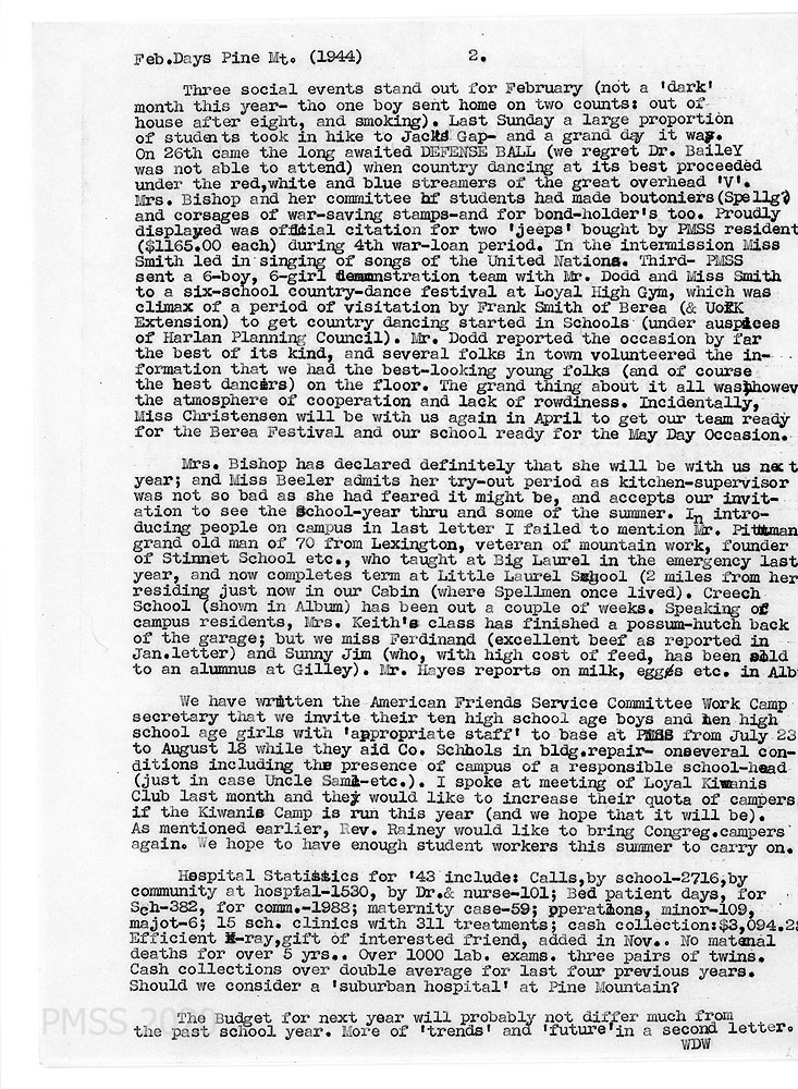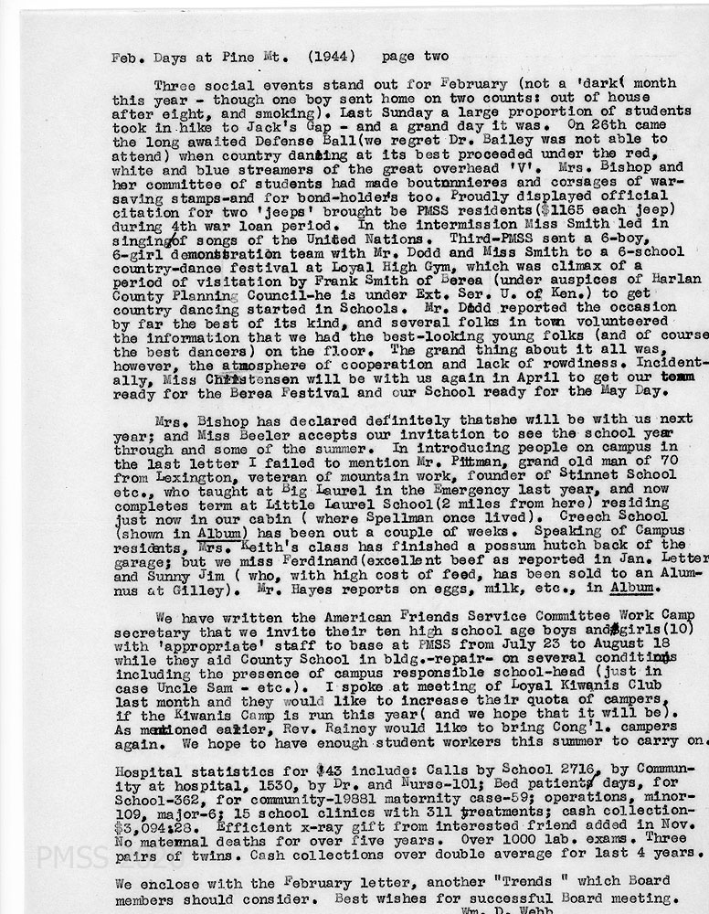 [006-Feb] Page 2. February social events; hike to Jack’s Gap; description of the Defense Ball, “when country dancing at its best proceed under the red, white, and blue streamers of the great overhead ‘V’”; PMSS students demonstrated at the country dancing festival at Loyal High Gym, taken there by Dodd and Miss Smith. Mention of Frank Smith of Berea who visited “to get country dancing started in schools.” Miss [Abby Winch] Christensen will visit in April to prepare students for the Berea Festival and May Day. Updates on staffing: Mrs. Bishop, Miss Beeler. Mr. Pittman, founder of Stinnett School and Big Laurel and Little Laurel teacher, is staying in the cabin where Spelman [John S. Spelman III] once lived. Mentions Mr. Hayes’ farm reports in the ALBUM. PMSS invited 10 boys and girls from the American Friends Service to PMSS to help with County school building. He mentions others interested in camps. Hospital statistics for 1943; x-ray gift. Encloses “Trends” for the Board to consider. Wm. D. Webb