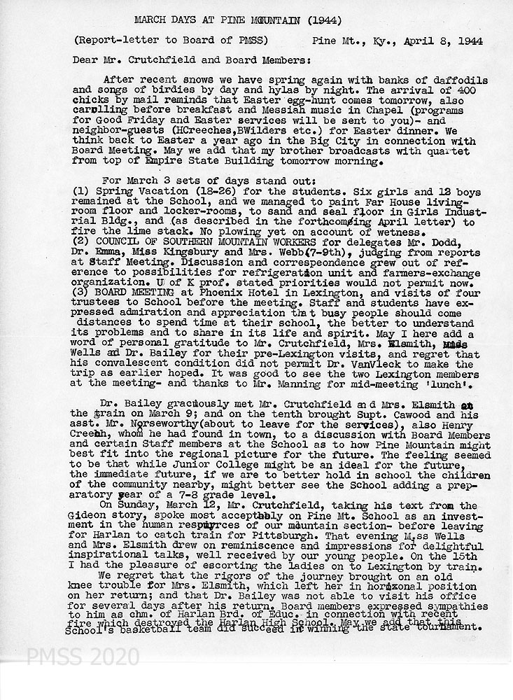 [008-Mar] “MARCH DAYS AT PINE MOUNTAIN (1944) (Report-letter to Board of PMSS), Pine Mt., Ky., April 8, 1944. Dear Mr. Crutchfield and Board Members:” Easter events; “…[M]y brother broadcasts with quartet from top of Empire State Building tomorrow morning.” Spring vacation activities; Council of Southern Mountain Workers delegates; Board Meeting at Phoenix Hotel, Lexington. (Trustees visited PMSS before and after the meeting.) Dr. Bailey, [James A.] Cawood, and his assistant, Mr. Norseworthy, met with PMSS Board and staff to discuss “how Pine Mountain might best fit into the regional picture for the future,” considering Junior College, or an additional preparatory year on 7-8 grade level. Speakers included Mr. Crutchfield on Sunday; Miss Wells and Mrs. Elsmith on reminiscences. Mention of Dr. Bailey as chairman of the Harlan Board of Education; and the Harlan High School fire.