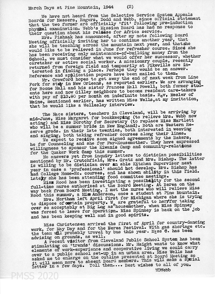 [009-Mar] Page 2. Still waiting to hear from the Selective Service System Appeals Board. Updates about Mrs. Pishzak and Mr. Crawford. Former students Boone Hall and his sister, Frances Hall Powell were hired to become Line Fork resident caretakers. Rev. Mesler of Maine will interview with Miss Wells at Wellesley. Also, updates about Margaret and Dorothy Nace, the Bakers, dietitian possibilities, Miss Rood, Miss Anderson, Mrs. Northam, Miss Spinney, Miss Christensen. Mr. Haight from the Cleveland Public School System was a recent visitor.