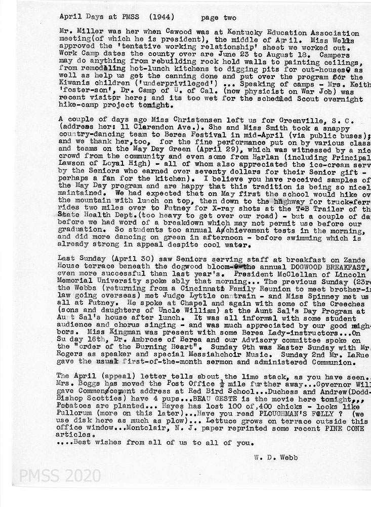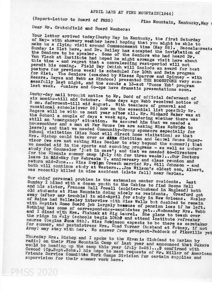 [010-Apr] Page 1. “APRIL DAYS AT PINE MOUNTAIN (1944) (Report-letter to Board of PMSS) Pine Mountain, Ky. May [truncated]. Dear Mr. Crutchfield and Board Members:” Senior students selected Dr. Bailey to speak at Baccalaureate. Upcoming events include Field Day and Swim program. Seniors presented the play, “The Moonstone,” coached by Misses Sparrow and Spinney, with Hayes and Webb as “Hindoos”); the Scouts presented “Tuocs Yob” program. Mr. Dodd and Mr. Webb have been temporarily deferred. Webb lists the various staffing activities, needs, and hirings; community news. Mentions Miss McBride, Miss Rood, Mrs. Bishop, Miss Beeler, Evelyn Creech who married Bill Johnson, Joe Wilson’s son Albert. He tells of personnel problems and updates at the extension center, mentioning Boone Hall and his sister, Frances Hall Powell, Crawford, Mesler of Maine, Mrs. Webb, Mrs. Pishsak, Miss Robinson, Mrs. Chad Turner. Mrs. Bishop and Webb spoke at the Kiwanis Club about last year’s Pine Mountain Camp. The Bakers will head this year’s camp, sponsored by the American Friends Service.