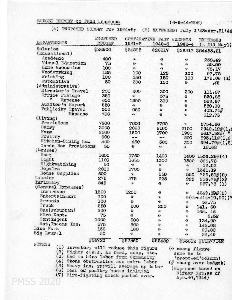 [017-June] BUDGET REPORT to PMSS Trustees – proposed for 1944-5; Expenses July 1943 through Apr 1944 (6/9/44 WDW)