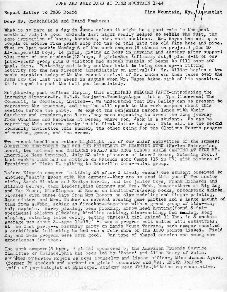 [018-June/July] “JUNE AND JULY DAYS AT PINE MOUNTAIN 1944,” Report letter to PMSS Board, Pine Mountain, Ky., August 1st. Dear Mr. Crutchfield and Board Members:” Newspaper Article: “Something New: 12 Youths Pay for Privilege of Learning Work,” July 30, 1944. Staff, students, and visitors picked green beans for several days. Community was invited to the PMSS Welcome Party to introduce the incoming director, H.R.S. Benjamin. Community also invited to the Glorious Fourth program. Two newspaper articles: “Something New: Youths Pay for the Privilege of Learning Work” (Harlan Enterprise), and “Children Frolic and Grow Strong While Camping at Pine Mt.” (Knoxville New Sentinel, July 23). A Time magazine article describes the Friends Work Camps (13 in U.S.). Lists the staff members who conducted workshops and activities for the Kiwanis campers; Also, the names of the leaders of the American Friends Service Work Camps.