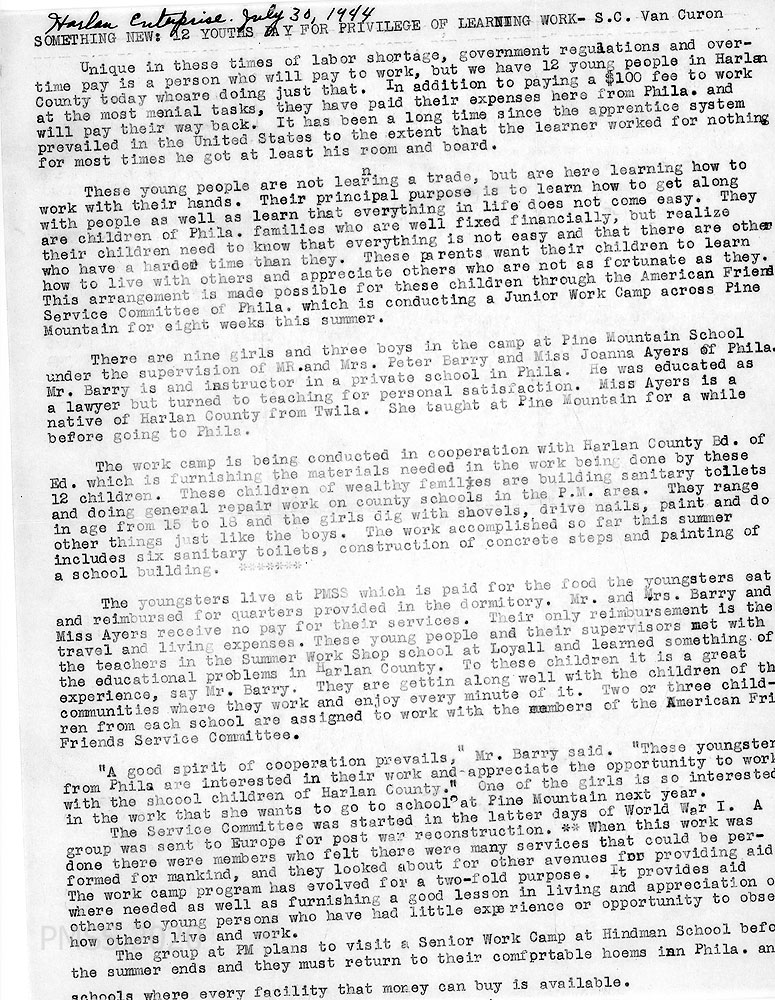 [020-July] Page 3. Transcription of newspaper article, “Something New: 12 Youths Pay for Privilege of Learning Work” by S.C. Van Curen (Harlan Enterprise, July 30, 1944). Young people come to the camp “from Philadelphia families who are well fixed financially, but realize their children need to know that everything is not easy and that there are others who have a harder time than they.” Arranged by the “American Friends Service Committee of Philadelphia, which is conducting a Junior Work Camp [at PMSS] for eight weeks this summer.” Supervised by Mr. and Mrs. Peter Barry and Miss Joanna Ayers (former PMSS teacher) of Philadelphia.