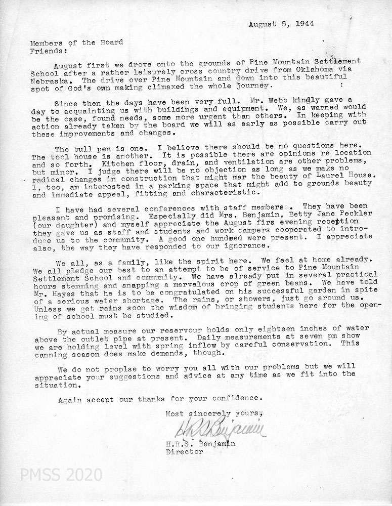 [021-Aug] August 5, 1944. Letter to Board from H.R.S. Benjamin, who arrived at PMSS from Oklahoma on August 1st to begin directorship. He noted improvements that need to be made to the bullpen, tool house, kitchen, and parking space. He met with staff; enjoyed the August first evening reception with staff, students, work campers, and community; helped with bean “stemming and snapping”; commented on the drought and the low water in the reservoir.