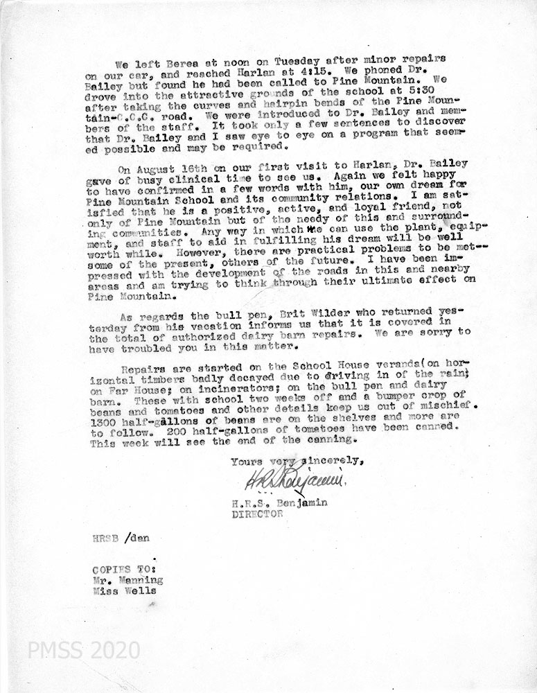 [023-Aug] Page 2. Benjamin continues describing his trip to PMSS; met with Dr. Bailey several times. “I am satisfied that he is a positive, active, and loyal friend, not only of Pine Mountain but of the needy of this and surrounding communities.” He wonders how the improved roads will affect Pine Mountain. He lists the buildings undergoing repairs and reports on the farm crops and canning. Copies to Mr. Manning and Miss Wells.