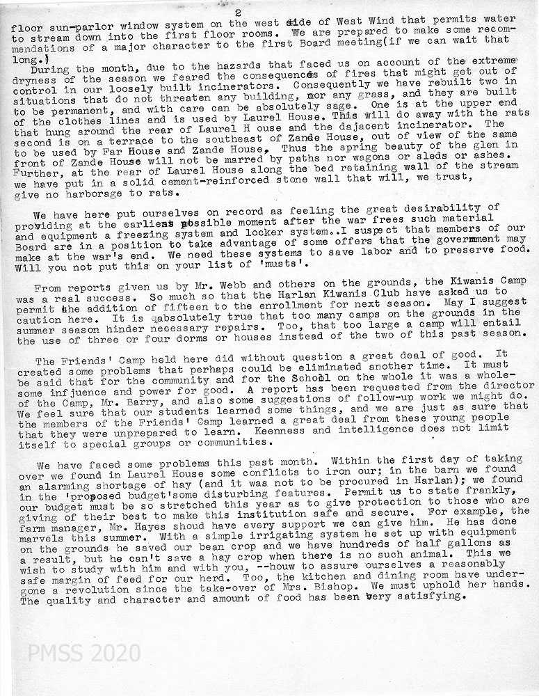 [026-Aug] (Page 2) ..West Wind sun-parlor windows. He describes rebuilding two incinerators so that they are safer from spread of fire in times of drought and from rats. Also, a stronger retaining stone wall was built along the stream at Laurel House. Asks the Board to consider the need for a “freezing system and locker system.” The Harlan Kiwanis Club wishes to increase camp attendance next year but Benjamin advises against it. He describes the “wholesome influence” from the Friends’ Camp. He reports on several problems, including enough feed for the herd. He tells of the good work done by Mr. Hayes (farm) and Mrs. Bishop (kitchen) and urges that they must be supported.