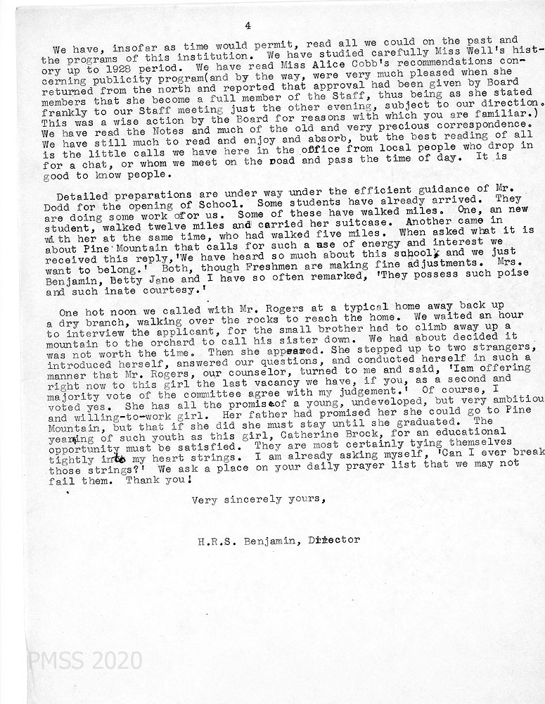 [027-Aug] (Page 4, sic) “We have…read all we could on the past and the programs of this institution,” including Miss Well’s history to 1928, Miss Alice Cobb’s recommendations for the publicity program (and that the Board approved her becoming a full staff member), Notes, and “the old and very precious correspondence.” He states that the best education is from the local people he talks with each day. Mr. Dodd is overseeing the opening of School and tells of eager students. Benjamin interviewed a prospective student, Catherine Brock, and, impressed, offered her the last vacancy. “They [youth yearning for an education] are most certainly tying themselves tightly into my heart strings.”