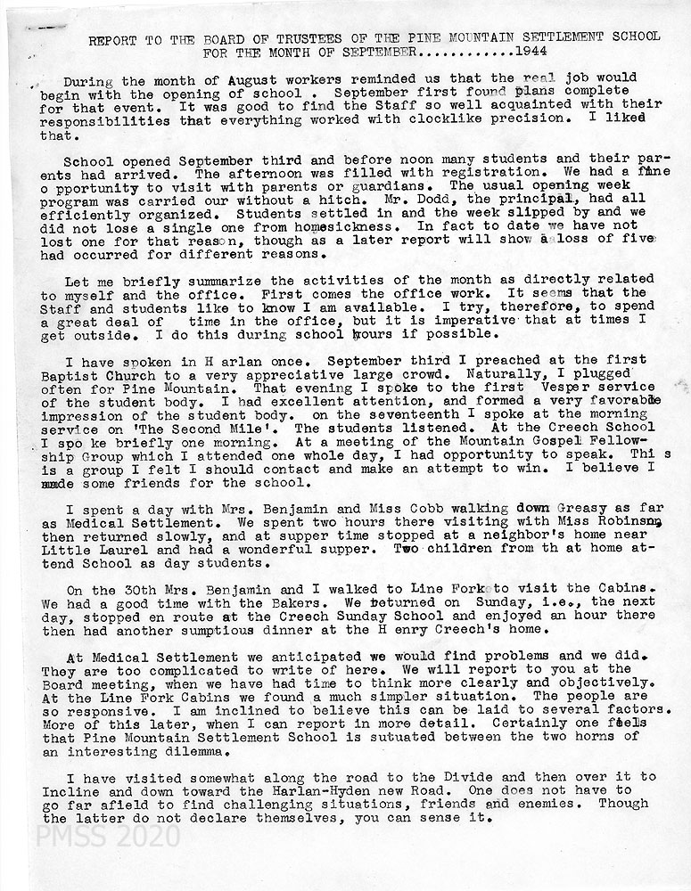 [028-Sept] (Page 1) “REPORT TO THE BOARD OF TRUSTEES OF THE PINE MOUNTAIN SETTLEMENT SCHOOL FOR THE MONTH OF SEPTEMBER 1944.” School opening; Benjamin’s preaching and talks; visit with Miss Robinson at the Medical Settlement; visit with the Bakers at the Line Fork Cabins. Problems at the Medical Settlement: “Certainly one feels that Pine Mountain Settlement School is situated between the two horns of an interesting dilemma.” Visits with the community: “One does not have to go far afield to find challenging situations, friends, and enemies. Though the latter do not declare themselves, you can sense it.”