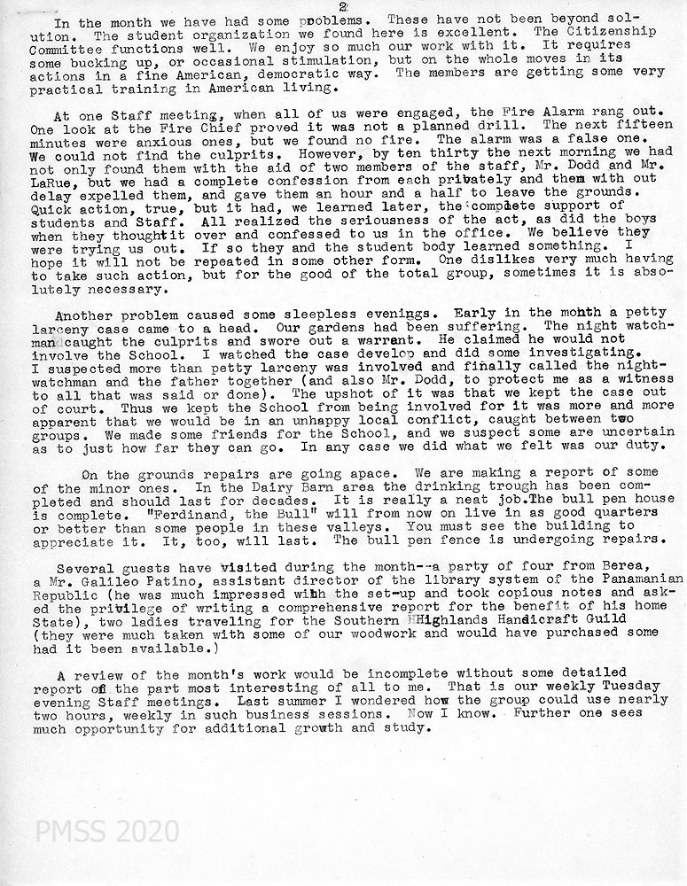 [029-Sept] (Page 2) Citizenship Committee; two students expelled for a false fire alarm. Benjamin resolved a petty larceny case before it went to court. Grounds repairs in the Dairy Barn and bullpen. Visitors included Mr. Galileo Patino from the Panamanian Republic and two from the Southern Highlands Handicraft Guild. Weekly staff meetings.