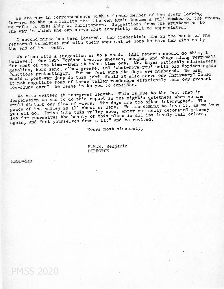 [031-Sept] (Page 4) Miss Abby W. Christensen may rejoin the staff; hiring of a second nurse; Mr. Hayes needs to replace his 1927 Fordson tractor with possibly a post-war jeep.