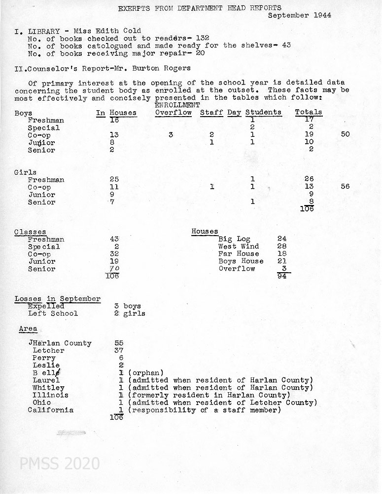 [032-Sept] “EXCERPTS FROM DEPARTMENT HEAD REPORTS, September 1944.” LIBRARY (Edith Cold), COUNSELOR (Burton Rogers – enrollment and demographic statistics).