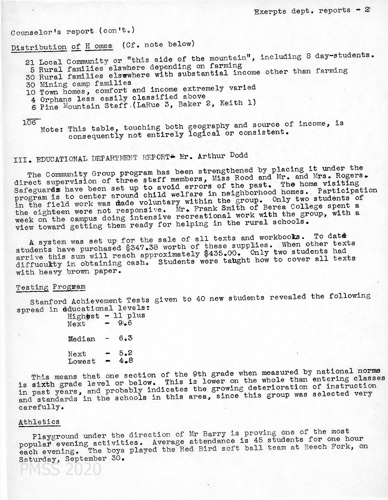 [033-Sept] Dept Reports, page 2. EDUCATIONAL DEPARTMENT (Arthur Dodd): supervised by Miss Rood and Mr. and Mrs. Rogers. Home visiting program will focus on child welfare. Frank Smith of Berea College did recreational work with students, readying them for assisting at rural schools. Sale of textbooks and workbooks; covering books in heavy brown paper. Stanford Achievement Tests reveal education levels. Mr. Barry, playground supervisor.