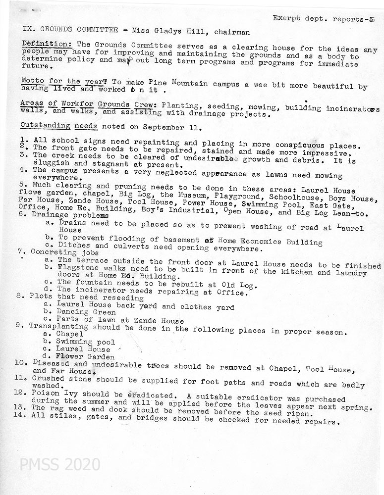 [036-Sept] Dept Reports, page 5. GROUNDS COMMITTEE (Gladys Hill, chairman). Defines the purpose of the Grounds Committee; lists outstanding needs.