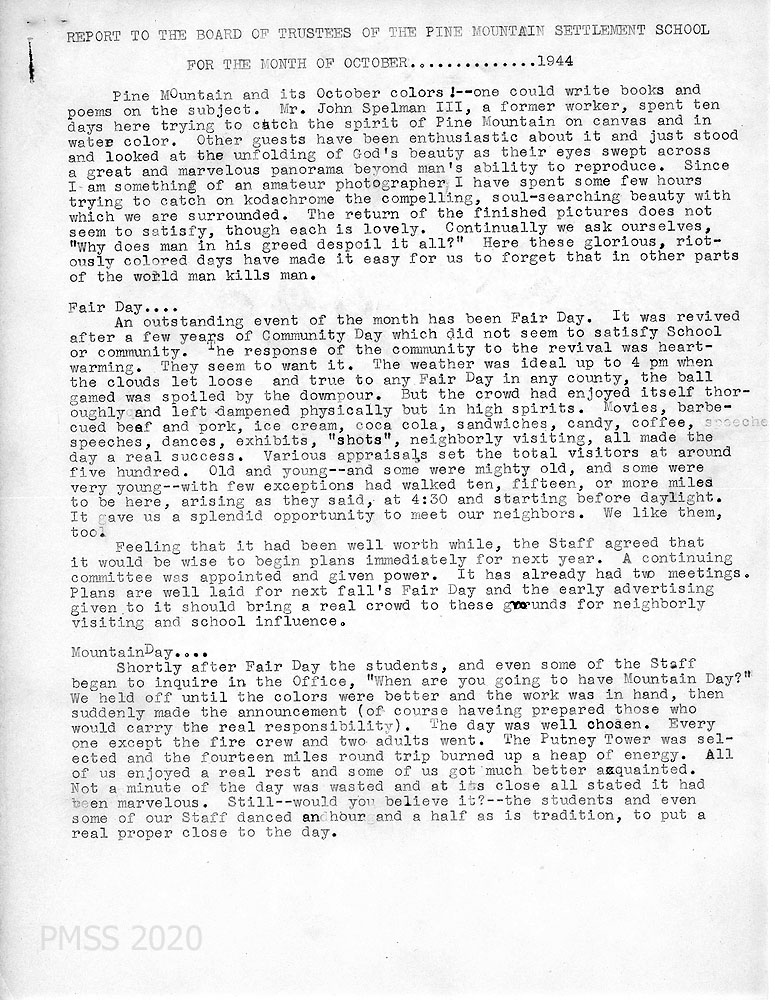 [001-Oct] Page 1. “REPORT TO THE BOARD OF TRUSTEES OF THE PINE MOUNTAIN SETTLEMENT SCHOOL FOR THE MONTH OF OCTOBER 1944.” Fall colors; “John Spelman III, spent ten days here trying to catch the spirit of Pine Mountain on canvas and in watercolor…. Since I am something of an amateur photographer I have spent some few hours trying to catch on Kodachrome the compelling soul-searching beauty with which we are surrounded.”