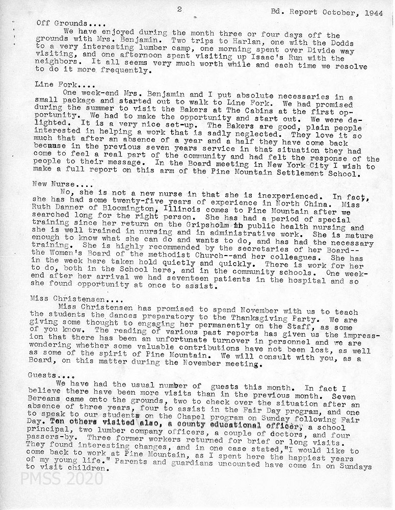 [002-Oct] Page 2. OFF GROUNDS: Mr. and Mrs. Benjamin enjoyed several days off the ground visiting Harlan, a lumber camp, and neighbors at Divide and Isaac’s Run. LINE FORK: Mr. and Mrs. Benjamin walked to Line Fork to visit the Bakers at “The Cabins.” The Bakers worked for seven years, left for a year and a half, then returned as “they had come to feel a real part of the community and had felt the response of the people to their message.” NEW NURSE: Miss Ruth Danner of Bloomington, Ill., who had 25 years of experience in North China. MISS CHRISTENSEN: Will spend November at PMSS to teach students the dances in preparation for the Thanksgiving Party. GUESTS: Several from Berea College to work on various projects, and ten other people, whom he describes.