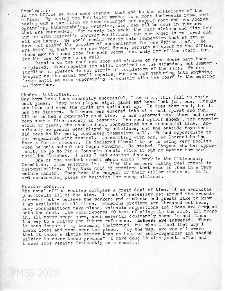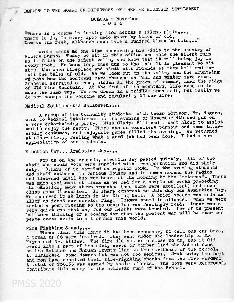 [001-Nov] Page 1. “REPORT TO THE BOARD OF DIRECTORS OF THE PINE MOUNTAIN SETTLEMENT SCHOOL – November 1944.” MEDICAL SETTLEMENT’S HALLOWEEN: Put on by a group of the Community students, with their advisor, Mr. Rogers. ELECTION DAY, ARMISTICE DAY: PMSS supplied transportation for voters; “returns” on the radio; pre-election day stump speeches and discussions at PMSS. Armistice Day observed at lunch in the Dining Hall with a speech, the service flag, and a poem. FIRE FIGHTING SQUAD: Called out three times this month, led by Mr. Hayes and Mr. Wilder. Describes the fire’s location and damage. The boys contributed their earnings to the athletic fund.