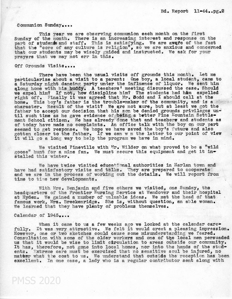 [002-Nov] Page 2. COMMUNION SUNDAY; Observed each month this year; “We are aware of the fact that the ‘core of any culture is religion,’ so we are anxious and concerned that our students may be wisely guided and instructed.” OFF GROUNDS VISITS: Tells a story about successfully disciplining a boy (who came inebriated to the Saturday night dancing party) after visiting with his father. Other visits: to educational authorities in Harlan; headquarters of the Frontier Nursing Service at Wendover and their hospital in Hyden, and the head, Mrs. Breckenridge. Although valuable ideas were gained, “[w]e learned that they have plenty of problems themselves.” CALENDAR OF 1945: “…[O]ne or two sketches could cause some misunderstanding we feared.” After consultation with older workers and a local man, it was decided to send the calendar to areas outside the community only. “Extreme care must be exercised that no sensitive soul be injured, no matter what the cost to us.”
