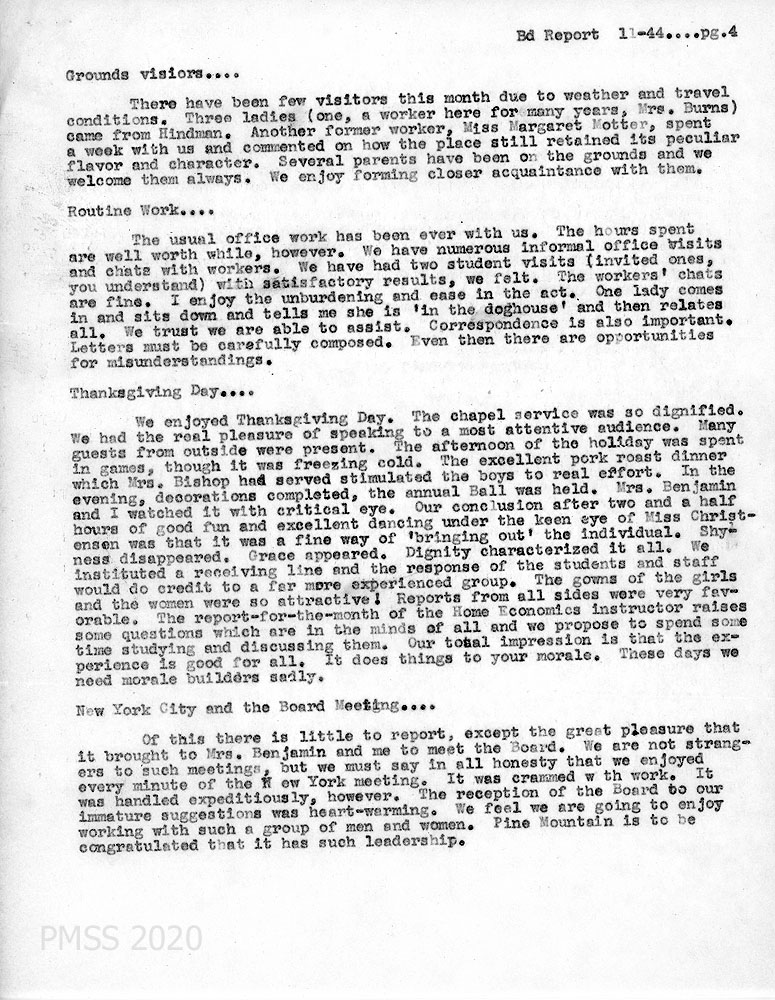 [004-Nov] Page 4. GROUNDS VISITORS: A former work, Mrs. [Martha] Burns, came from Hindman, with two other ladies; former worker, Margaret Motter spent a week at PMSS; and students’ parents. ROUTINE WORK: Office work and visits; student visits; correspondence. THANKSGIVING DAY: Chapel service; games; pork roast dinner; annual Ball. NEW YORK CITY AND THE BOARD MEETING: He and Mrs. Benjamin “enjoyed every minute of the New York meeting.”