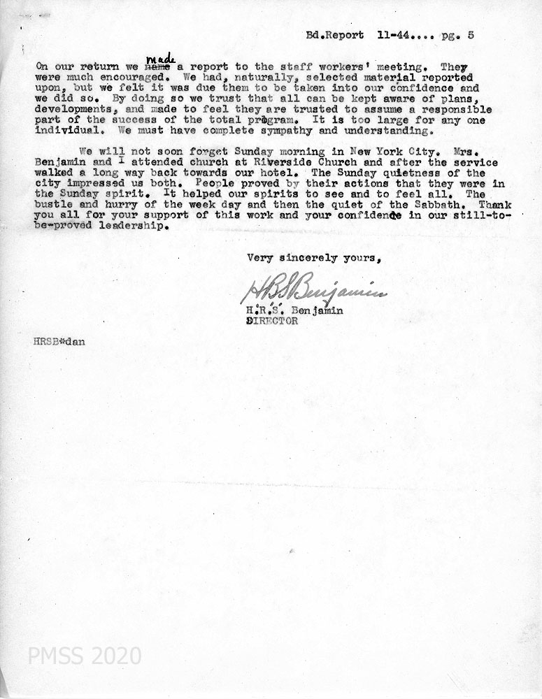 [005-Nov] Page 5. Benjamin reported on the NYC board meeting at the staff workers’ meeting. “By doing so we trust that all can be kept aware of plans, developments, and made to feel they are trusted to assume a responsible part of the success of the total program. It is too large for any one individual. We must have complete sympathy and understanding.”