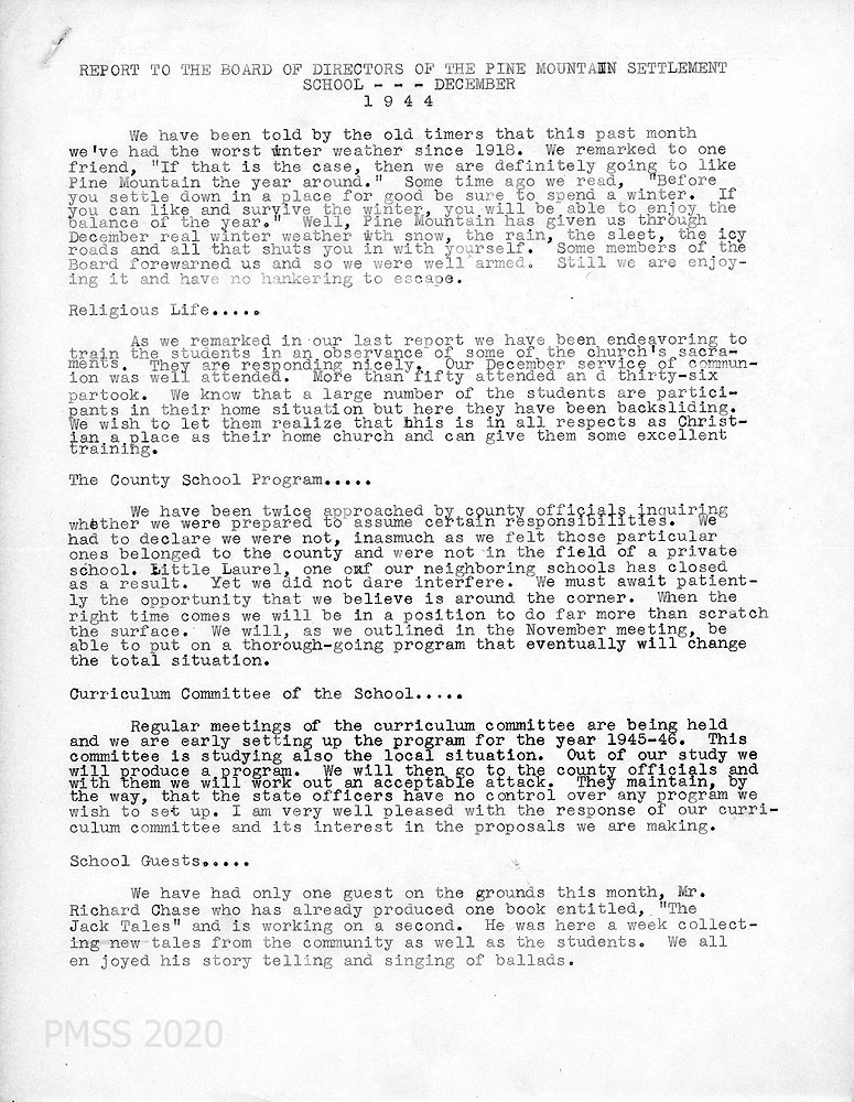 [001-Dec] December 1944. “REPORT TO THE BOARD OF DIRECTORS OF THE PINE MOUNTAIN SETTLEMENT SCHOOL.” Enduring the winter weather. RELIGIOUS LIFE: Training students in the church’s sacraments. THE COUNTY SCHOOL PROGRAM: So far, PMSS has resisted assuming certain responsibilities that the county officials are proposing. “[W]e felt those particular ones belonged to the county and were not in the field of a private school. Little Laurel, one of our neighboring schools has closed as a result.” CURRICULUM COMMITTEE OF THE SCHOOL: The committee is meeting regularly to “study the local school situation” and to set up a 1945-46 program. SCHOOL GUESTS: Mr. Richard Chase, who wrote “The Jack Tales” is working on a second book, collecting new tales from students and the community.