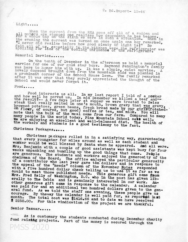 [002-Dec] LIGHT: A greater appreciation for electricity was felt after an outage of current from the REA [Rural Electrification Administration] for a day. MEMORIAL SERVICE: A service was held for one of PMSS’s “gold star boys,” Raymond Pennington, including planting of a dogwood tree in the School House lawn. FOOD: Description of a meal after a beef was killed. “…[T]he bulk of the meal came from our farm.” CHRISTMAS PACKAGES: Mrs. Benjamin and her assistants prepared donated items for community youngsters, students, and workers. Gifts came from the chairman of the board; $500 from Mrs. Fred Kelly of Washington, DC, responding to the “needs” column in Notes; a donor to the general fund and production of the calendar. Cost of calendar was $1416.66 and donations amounted to $2258.00. SENIOR BAZAAR: A December charity fundraising project; lists money raised by various projects.