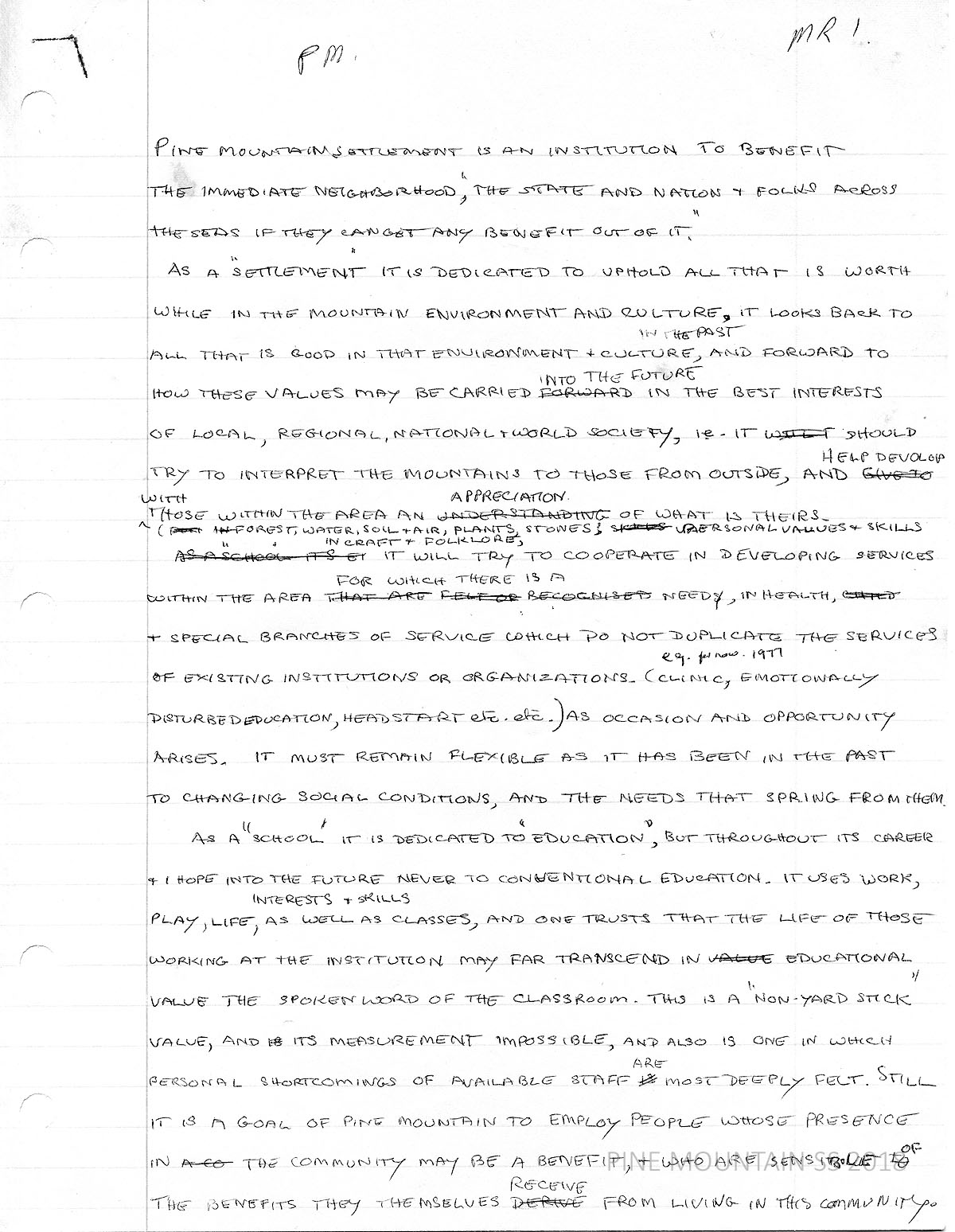 As a “settlement” it is dedicated to uphold all that is worthwhile in the mountain environment and culture. It looks back to all that is good in that environment & culture in the past, and forward to how these values may be carried into the future in the best interests of local, regional, national, & world society, i.e., it should try to interpret the mountains to those from outside and help develop with those within the area an appreciation of what is theirs (forest, water, soil & air, plants, stones, personal values, & skills in craft & folklore). It will try to cooperate in developing services within the area for which there is a need, in health & special branches of service which do not duplicate the services of existing institutions or organizations. (e.g., for now, 1977: clinic, emotionally disturbed education, Head Start, etc. etc.) as occasion and opportunity arises. It must remain flexible as it has been in the past to changing social conditions, and the needs that spring from them.
