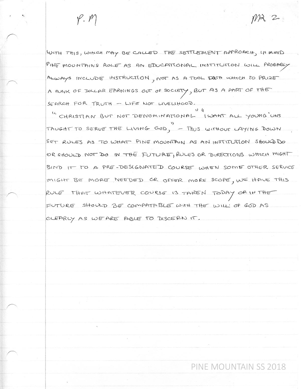 “Christian but not denominational” — “I want all young’uns taught to serve the livin’ God,” — Thus, without laying down set rules as to what Pine Mountain as an institution should do or should not do in the future, rules or directions which might bind it to a pre-designated course when some other service might be more needed or offer more scope, we have this rule that whatever course is taken today or in the future should be compatible with the will of God as clearly as we are able to discern it.