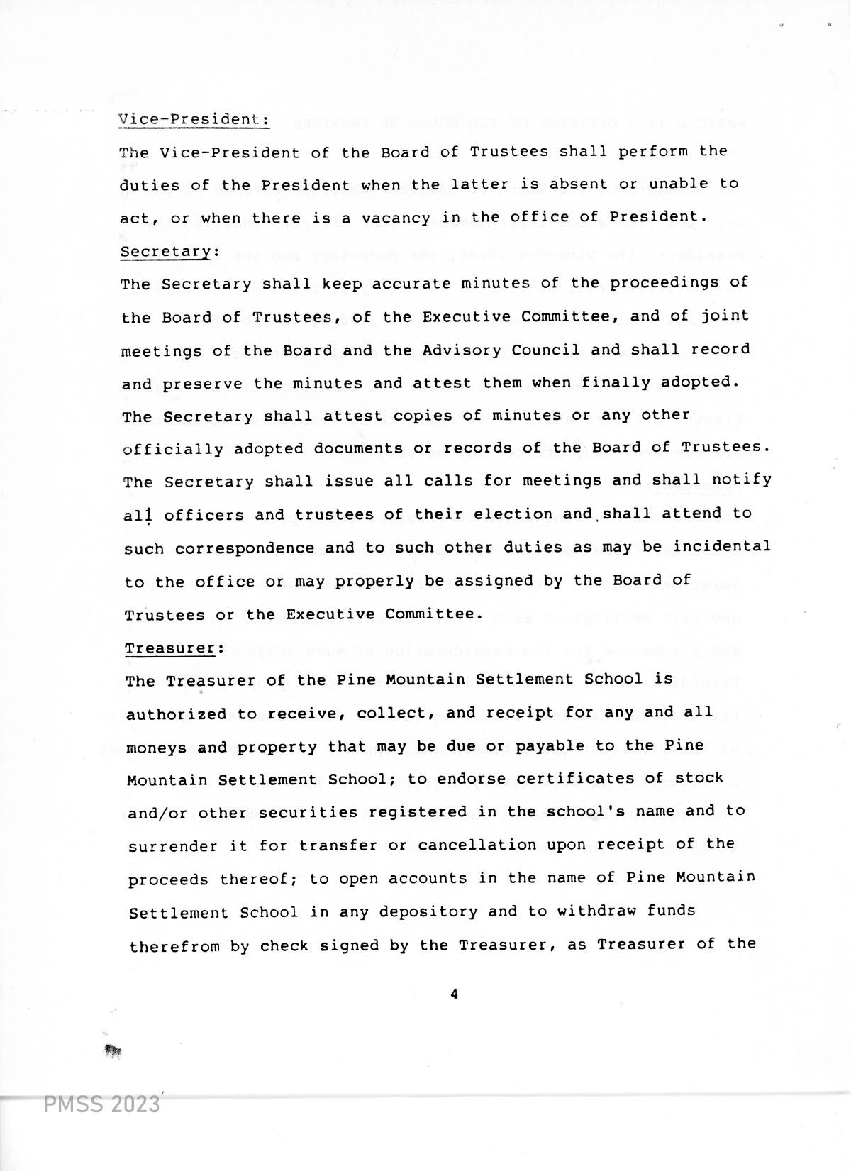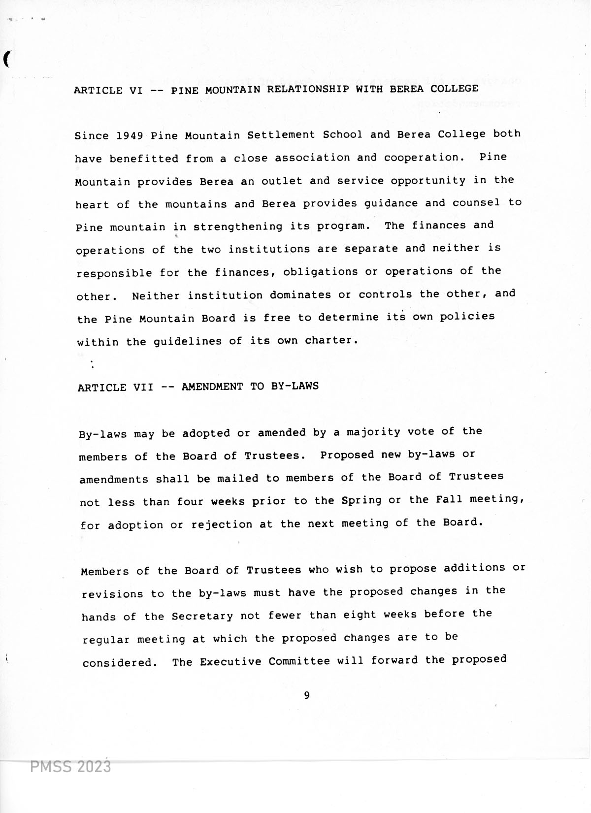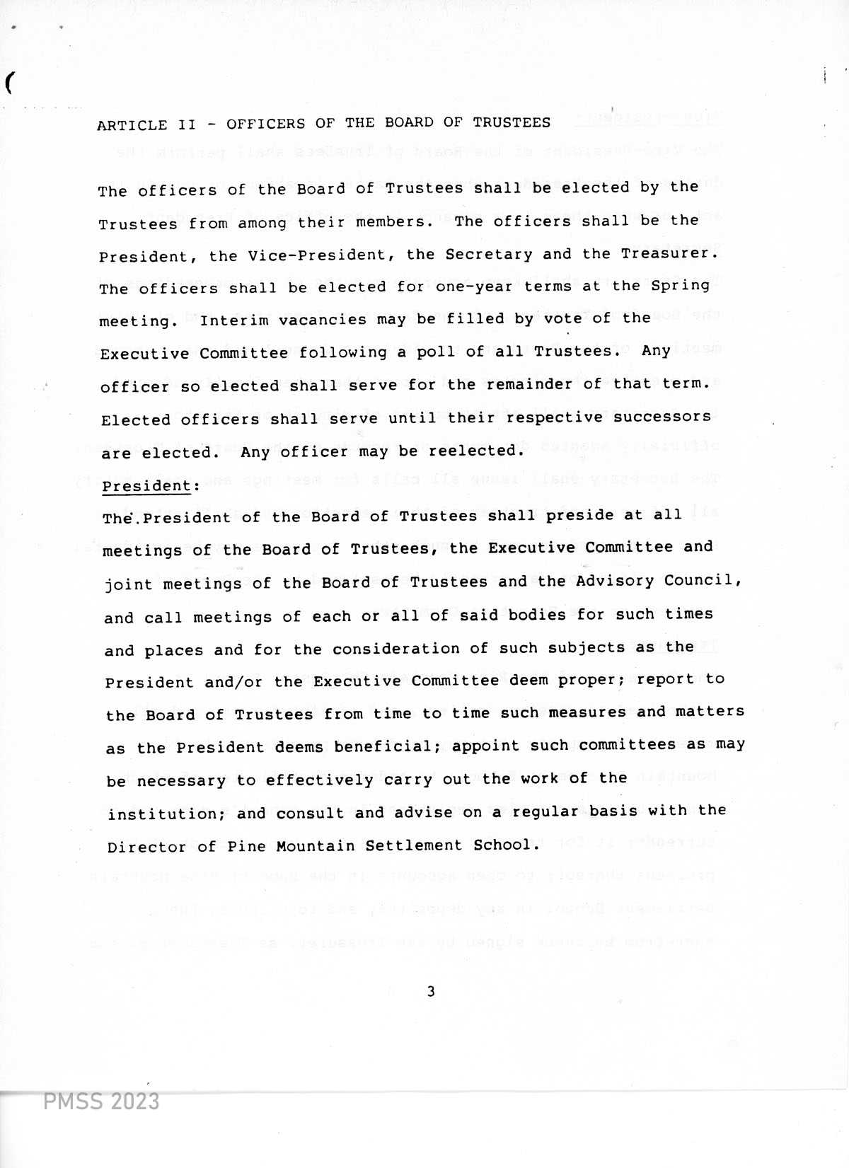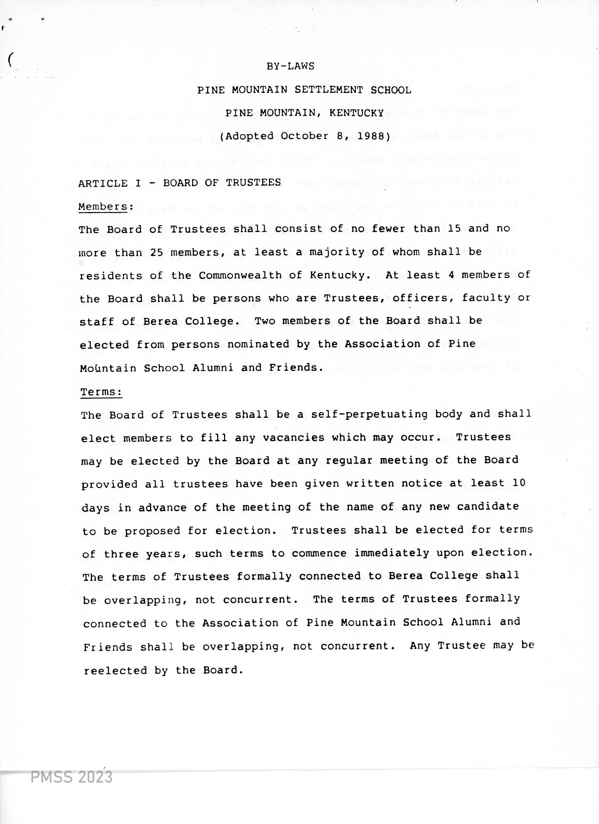 TAGS: 1988 By-Laws of Pine Mountain Settlement School, governance, PMSS Board of Trustees, institutional documents, Berea College, honorary trustees, Board of Trustees officers, Executive Committee, Advisory Council, by-law amendments