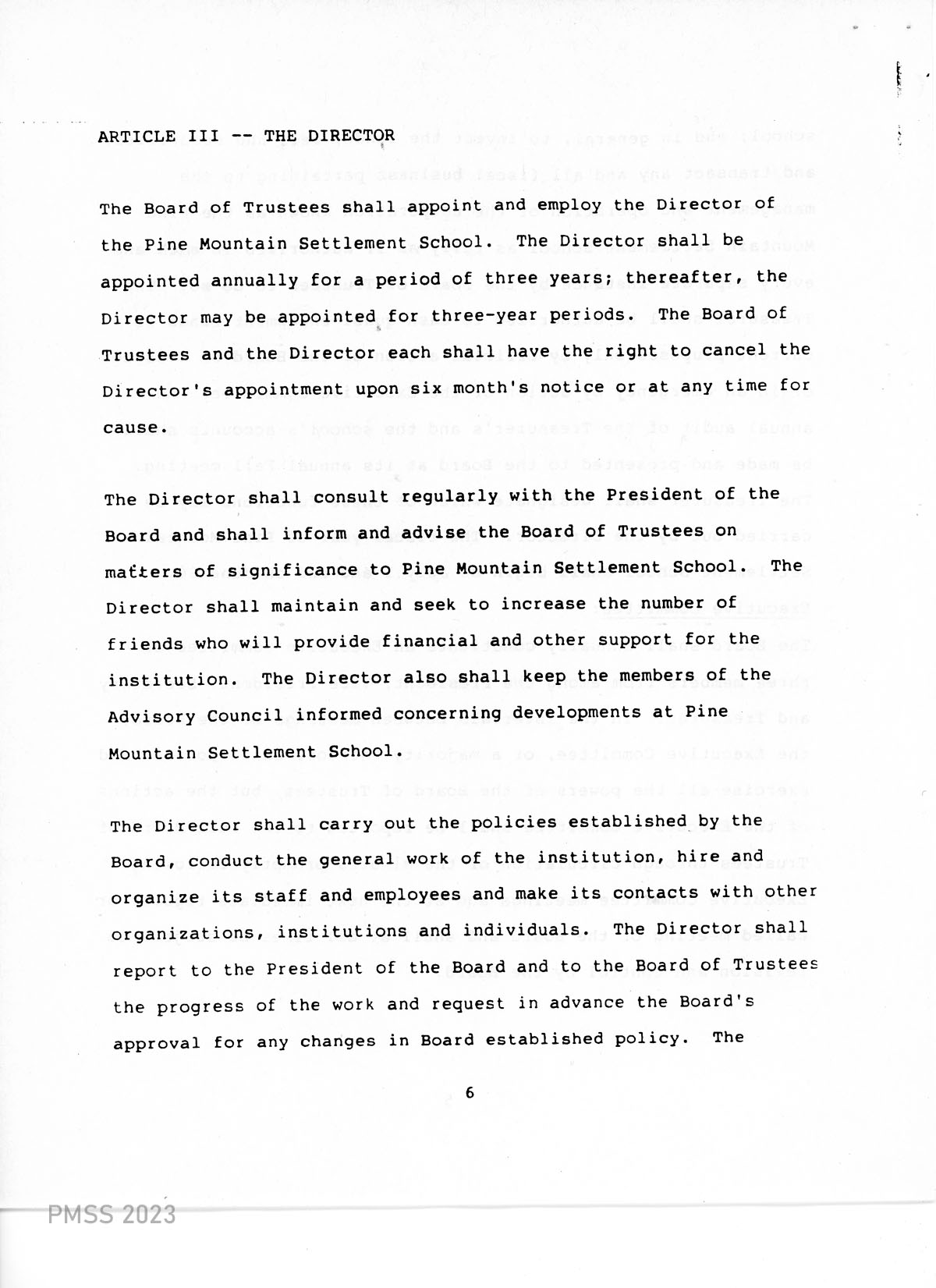 The Board of Trustees shall appoint and employ the Director of the Pine Mountain Settlement School. The Director shall be appointed annually for a period of three years; thereafter, the Director may be appointed for three-year periods. The Board of Trustees and the Director each shall have the right to cancel the Director’s appointment upon six month’s notice or at any time for cause.