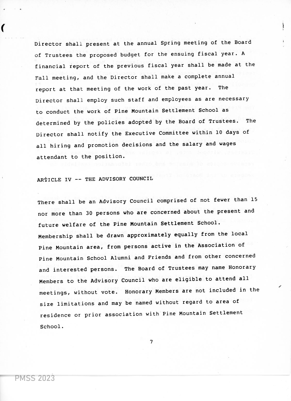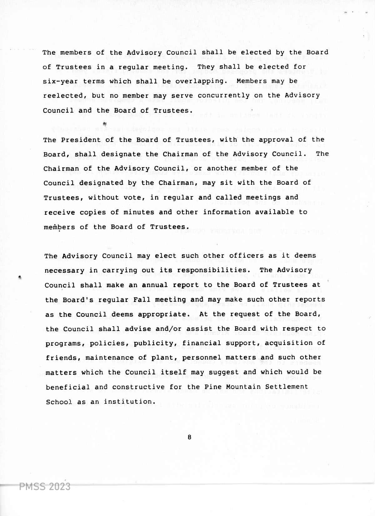 There shall be an Advisory Council comprised of not fewer than 15 nor more than 30 persons who are concerned about the present and future welfare of the Pine Mountain Settlement School. Membership shall be drawn approximately equally from the local Pine Mountain area, from persons active in the Association of Pine Mountain School Alumni and Friends and from other concerned and interested persons. The Board of Trustees may name Honorary Members to the Advisory Council who are eligible to attend all meetings, without vote. Honorary Members are not included in the size limitations and may be named without regard to area of residence or prior association with Pine Mountain Settlement School.