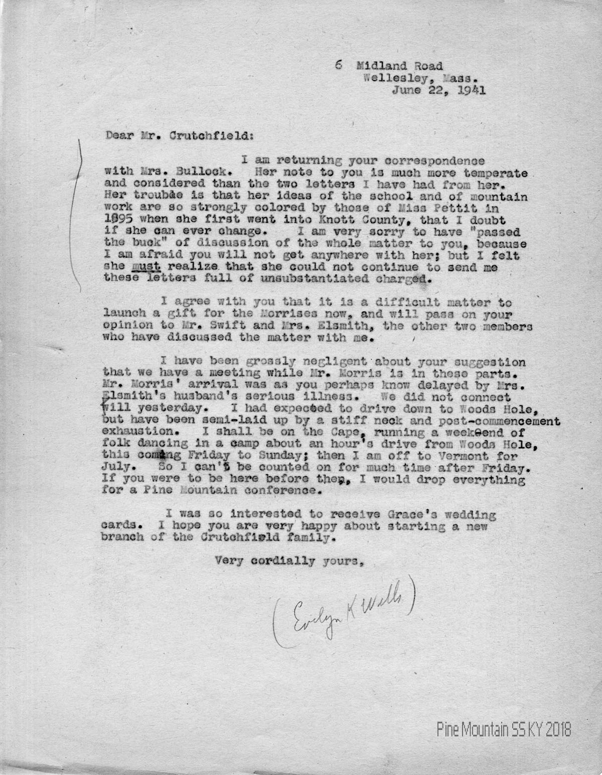 001 June 22, 1941. To Crutchfield from [unsigned, apparently Wells], in Wellesley, MA, commenting on Mrs. Bullock’s letters, indicating “her ideas of the school and of mountain work are so strongly colored by those of Miss [Katherine] Pettit in 1895 when she first went into Knott County, that I doubt if she can ever change.” Wells agrees with Crutchfield concerning a gift for the Morrises and will inform Mr. Swift and Mrs. [Dorothy Olcott] Elsmith of Crutchfield’s opinion. She indicates when she is free for a meeting with Mr. Morris at Woods Hole and mentions receiving wedding cards from Grace.