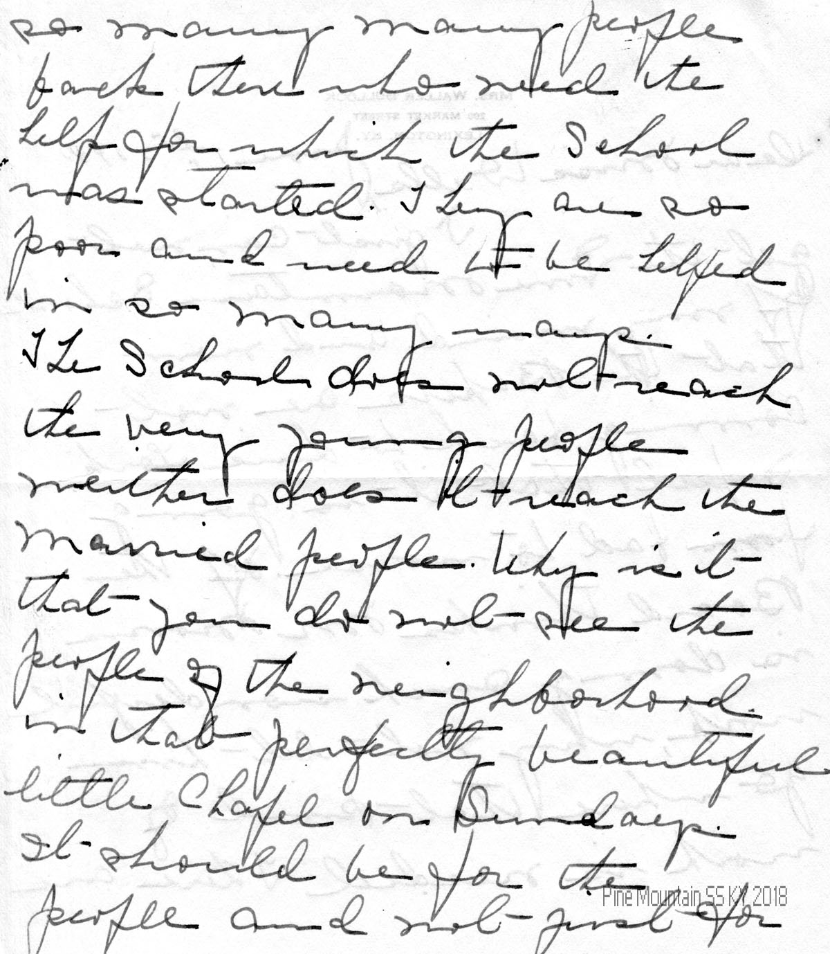 004-004d June 1, 1941. Five-page handwritten letter to Wells from Bullock in Lexington, KY, 004 who feels that the School “is going from bad to worse,” now that the Bakers are not returning to Line Fork. Morris should be allowed to “go where that kind of work is needed.” 004a She describes how many of the people “back there” need help. She feels that “The School does not reach the very young people …[nor] the married people”; the Chapel should be used by all, not just for 004b the students. 004c Bullock is “very much discouraged about the School” and asks that no-one sees her letter. She hopes to see [J.S.] Crutchfield soon. 004d She hopes that the board has “an ear to the ground [and that] it is not a deaf one.”