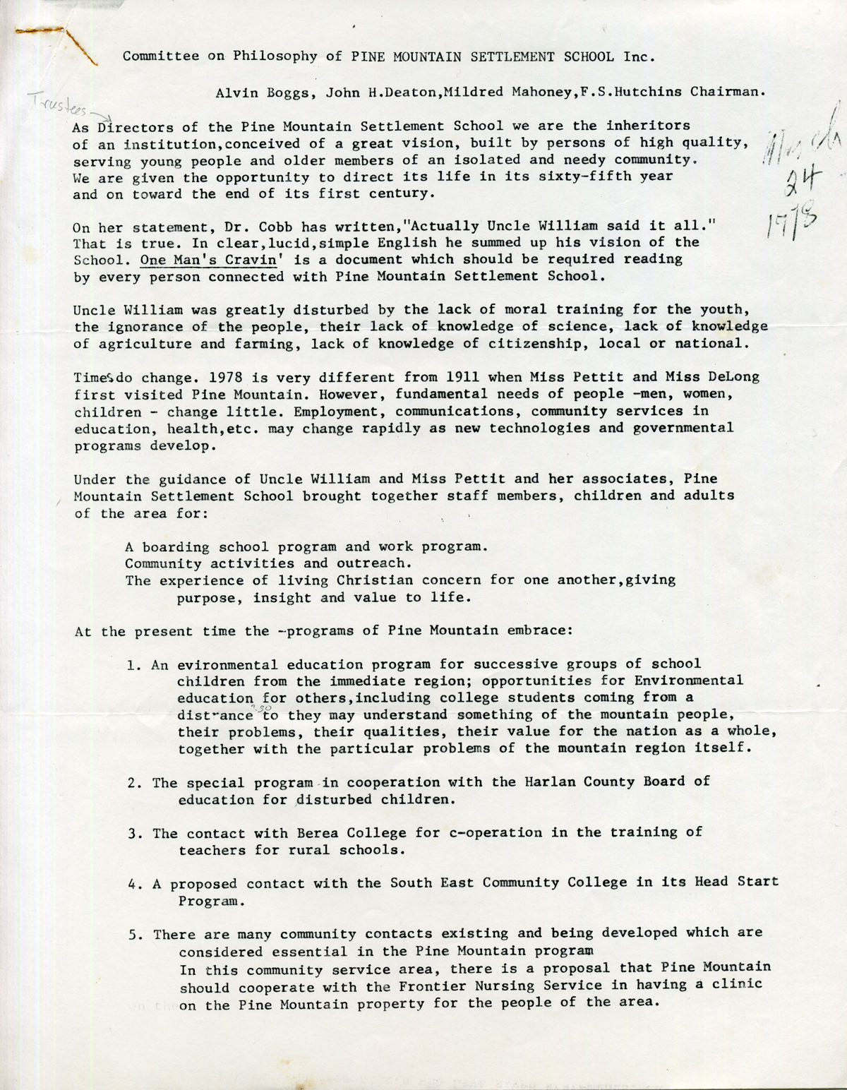 TAGS: Philosophy of Pine Mountain Settlement School, Willis Weatherford, PMSS Board of Trustees, statement of purpose of the Environmental Education Program, Dr. Francis Hutchins, Nancy Sather, subcommittees, Committee on Philosophy of PMSS, Alice Cobb, Mary Rogers, Marian Kingman, community