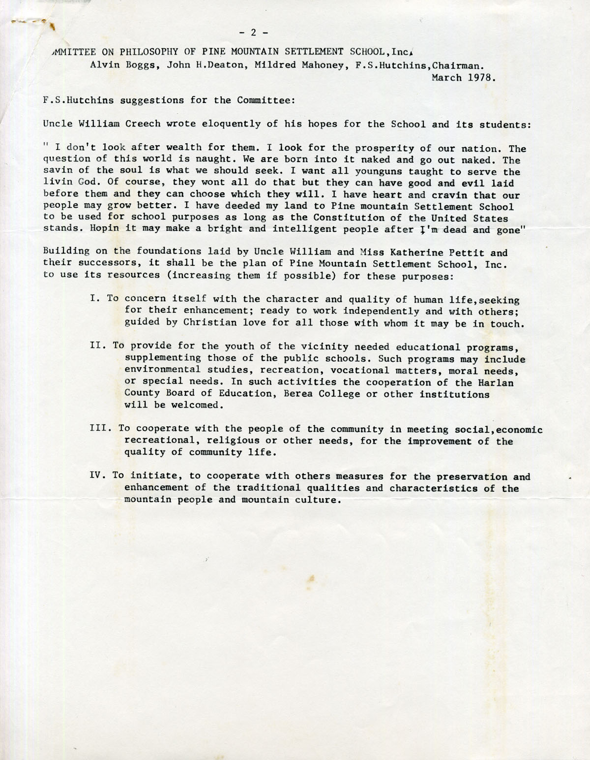 In 1977 Willis D. Weatherford Jr., then-President of the Board of Trustees at Pine Mountain, asked each board member to write a brief statement regarding their idea of the philosophy of the Pine Mountain Settlement School. The information would be gathered in order to develop strategic planning goals and objectives for the Board of Trustees of the School.