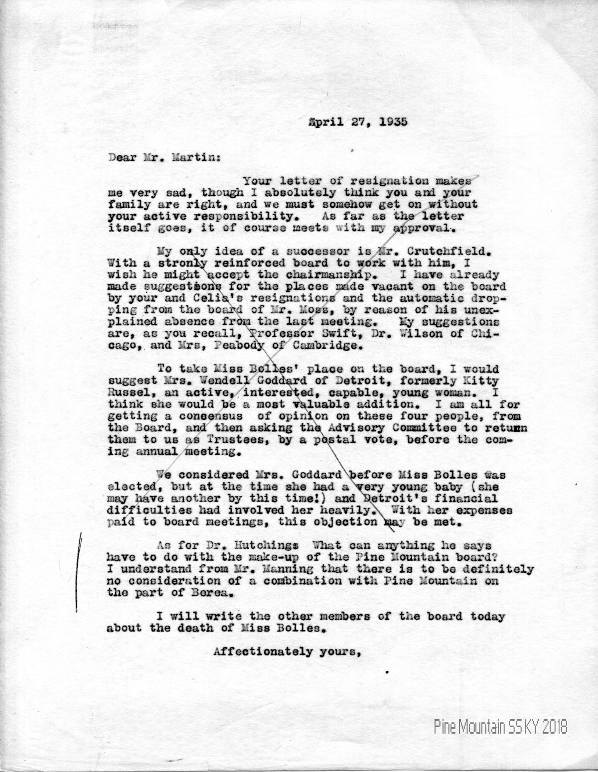 001 April 27, 1935. To “Mr. Martin” from [unsigned], acknowledges his resignation letter and suggests that Mr. [J.S.] Crutchfield is his successor. The writer suggests Professor Swift, Dr. [Alfred E.] Wilson of Chicago, and Mrs. Peabody of Cambridge to fill vacancies made by Crutchfield, Celia [Cathcart Holton], Mr. Moss; and Mrs. Wendell Goddard (formerly Kitty Russel) of Detroit to replace Miss Bolles [who has died].