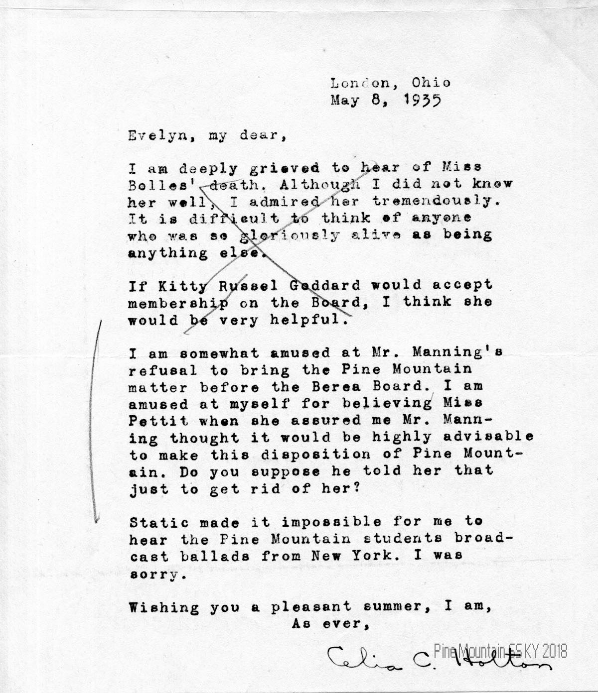 003 May 8, 1935. To “Evelyn” in London, OH, from Celia C. Holton, who is “grieved” to hear of Miss Bolles’ death, whom she admired. Holton hopes Kitty Russel Goddard will accept Board membership ; is amused that Mr. Manning refuses to “bring the Pine Mountain matter before the Berea Board.” ; mentions “Pine Mountain students broadcasting ballads from New York.”