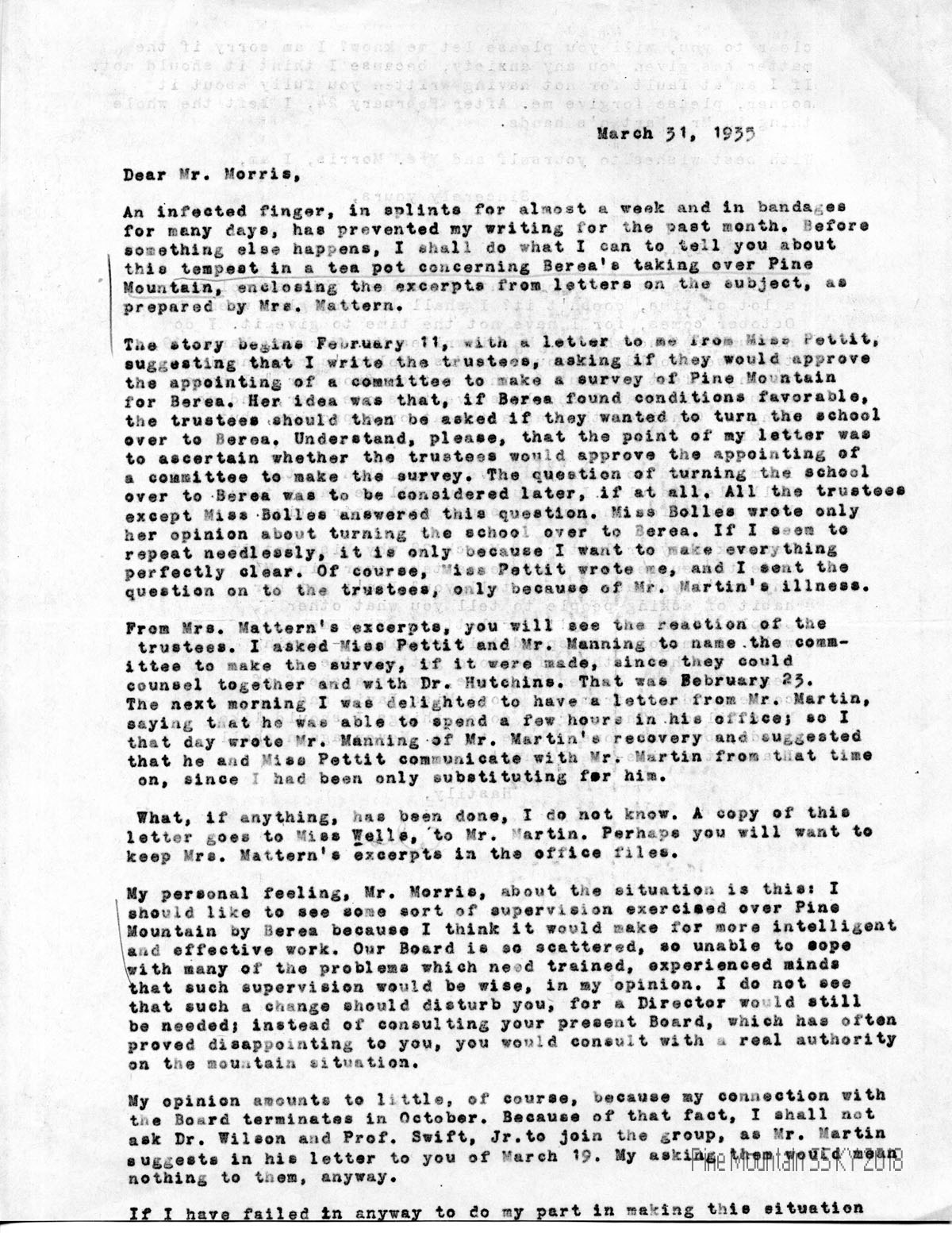 004-004a March 31, 1935. Two-page letter to Morris from [unsigned, possibly Evelyn Wells], who provides background information concerning “this tempest in a tea pot concerning Berea’s taking over Pine Mountain, enclosing the excerpts from [trustees’] letters on the subject, as prepared by Mrs. Mattern.”