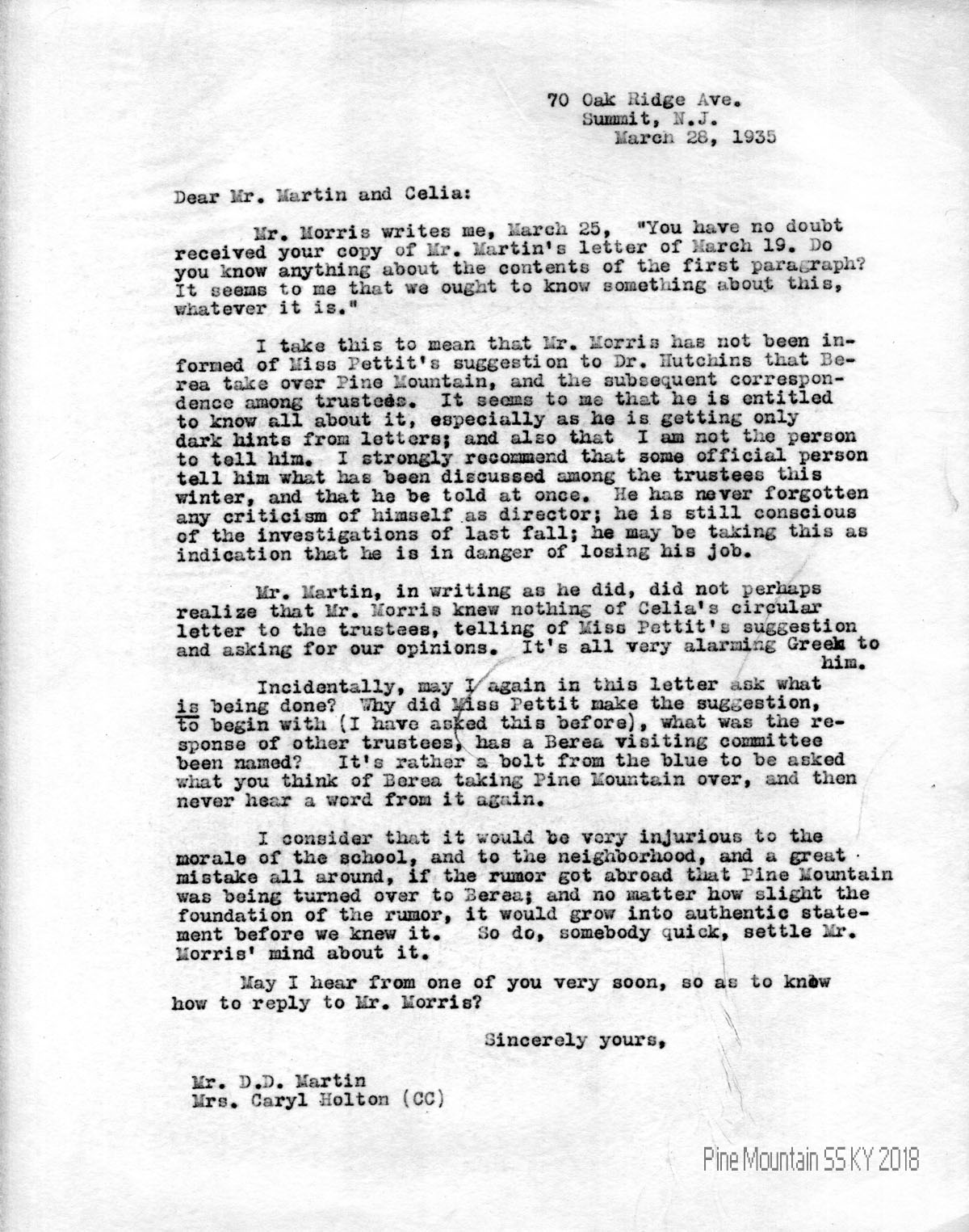 Mrs. Ball005 March 28, 1935. To “Mr. Martin and Celia,” cc: Mrs. Caryl Holton from [unsigned] in Summit, NJ,, who states that Morris may not know about Miss Petit’s suggestion to Dr. Hutchins that Berea take over Pine Mountain. Fearing that rumors may circulate in the community about this possibility, the writer asks that someone “settle Mr. Morris’ mind about it.” The writer then asks several questions about what is being done about the matter/