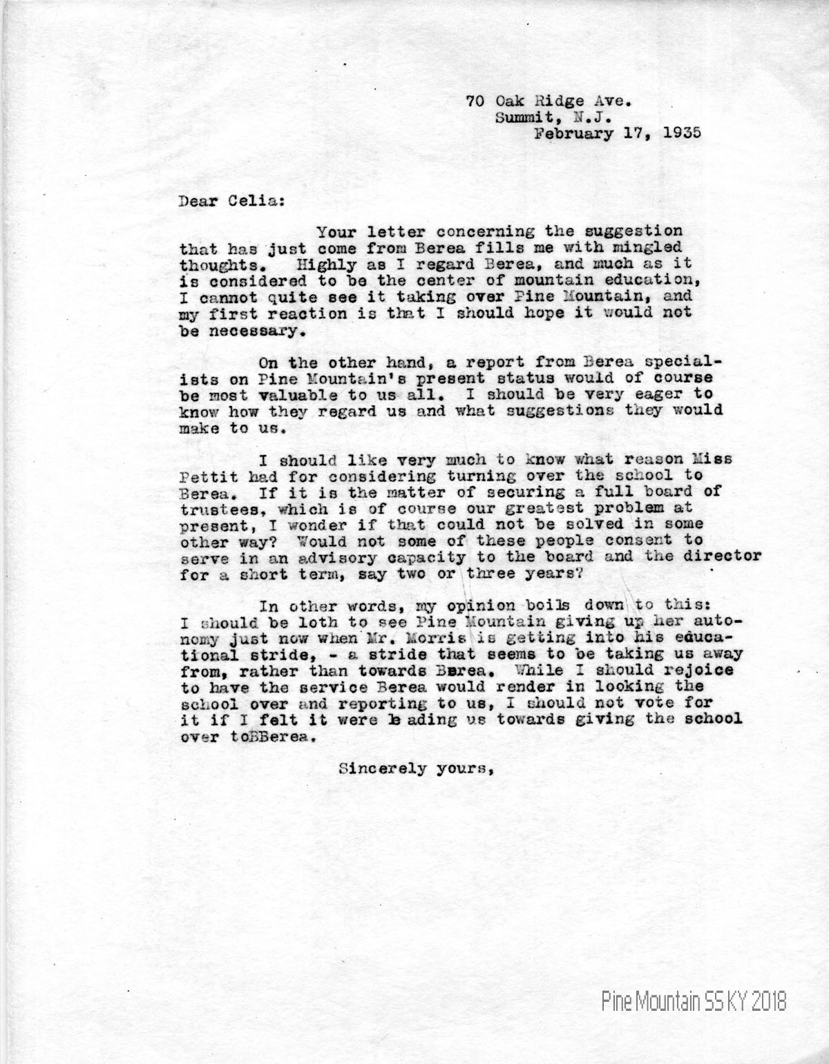 006 February 17, 1935. To “Celia” from [unsigned] in Summit, NJ. “I should be [loathe] to see Pine Mountain giving up her autonomy just now when Mr. Morris is getting into his educational stride, – a stride that seems to be taking us away from, rather towards Berea.” She asks why Miss Pettit was considering turning over the school to Berea. “If it is the matter of securing a full board of trustees, which is of course our greatest problem at present, I wonder if that could not be solved in some other way?”