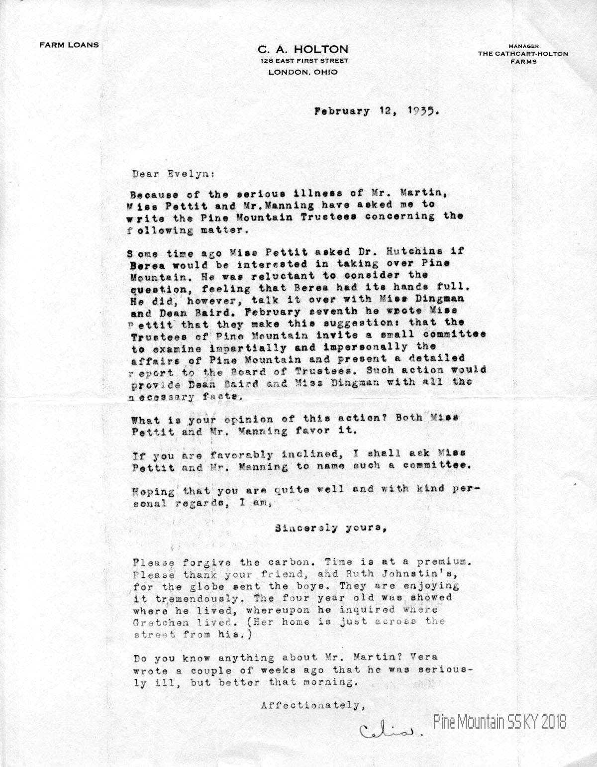 007 February 12, 1935. To “Evelyn” from “Celia” on letterhead for “C.A. Holton…London, OH, Manager, The Cathcart-Holton Farms. She presents a timeline of the actions leading to Berea College suggesting that the PMSS trustees “invite a small committee to examine…the affairs of Pine Mountain and present a detailed report to the Board of Trustees. Such action would provide Dean Baird and Miss Dingman with all the necessary facts.” Celia asks for Evelyn’s opinion.
