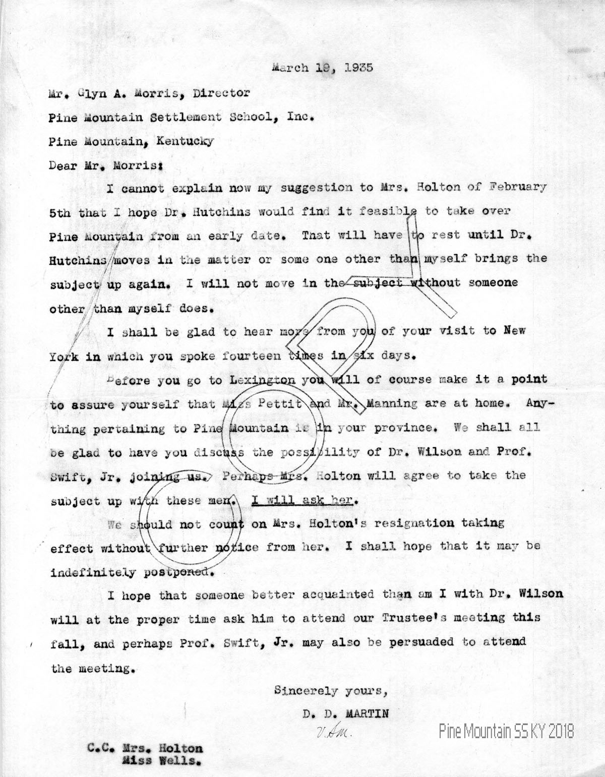 002 March 19, 1935. To Glyn A. Morris, Director, from [indecipherable signature] who suggested to Mrs. Holton of February 5th that “I hope Dr. Hutchins would find it feasible to take over Pine Mountain from an early date.” The writer will not bring the subject up unless someone else does. The writer mentions Morris’s New York visit “in which you spoke fourteen times in six days” ; advises discussing possible board members (Dr. Wilson and Prof. Swift, Jr.) when visiting Miss Pettit and Mr. Manning in Lexington ; mentions the possibility that Mrs. [Celia C.] Holton may resign.