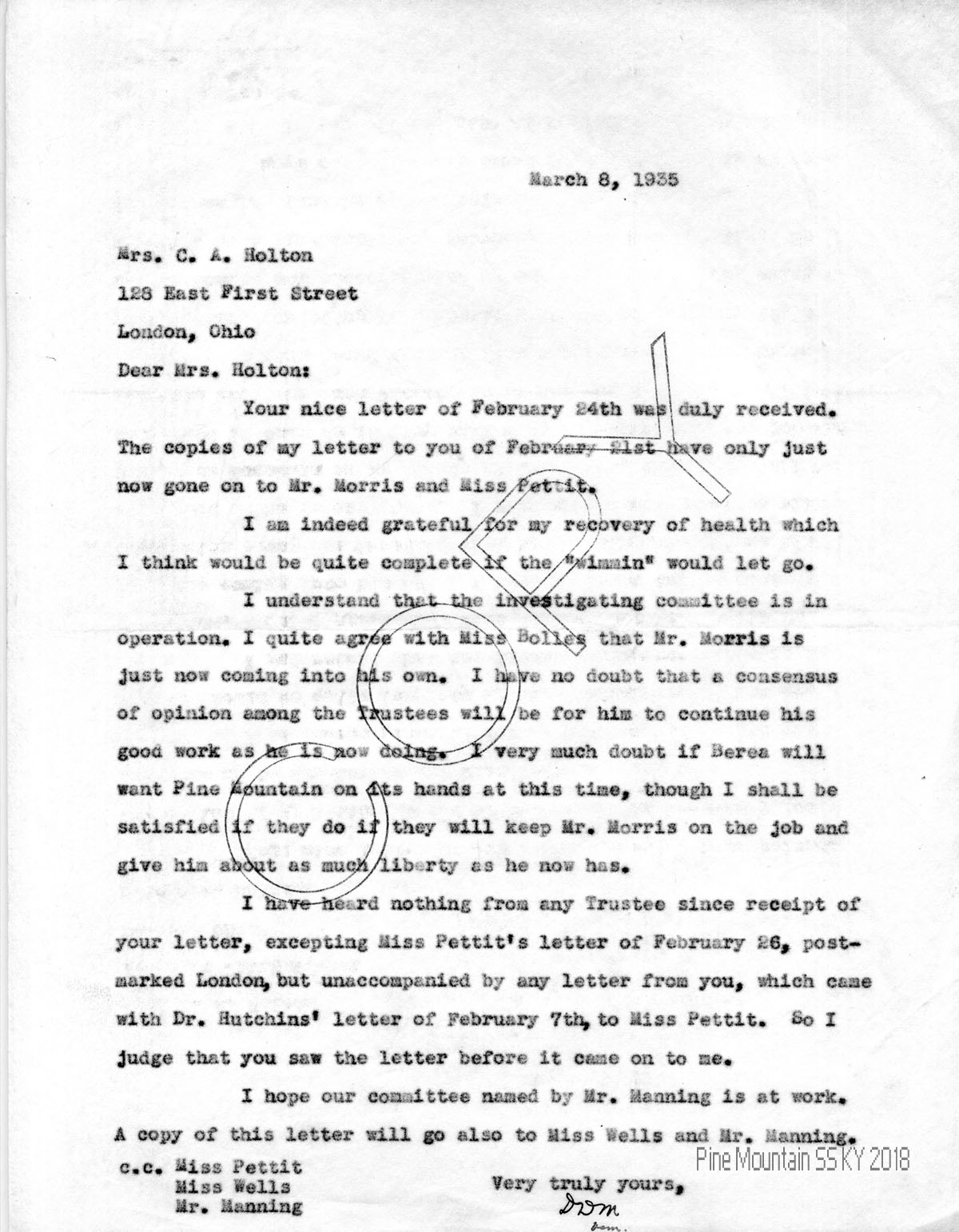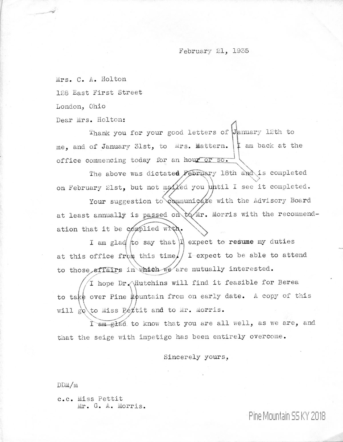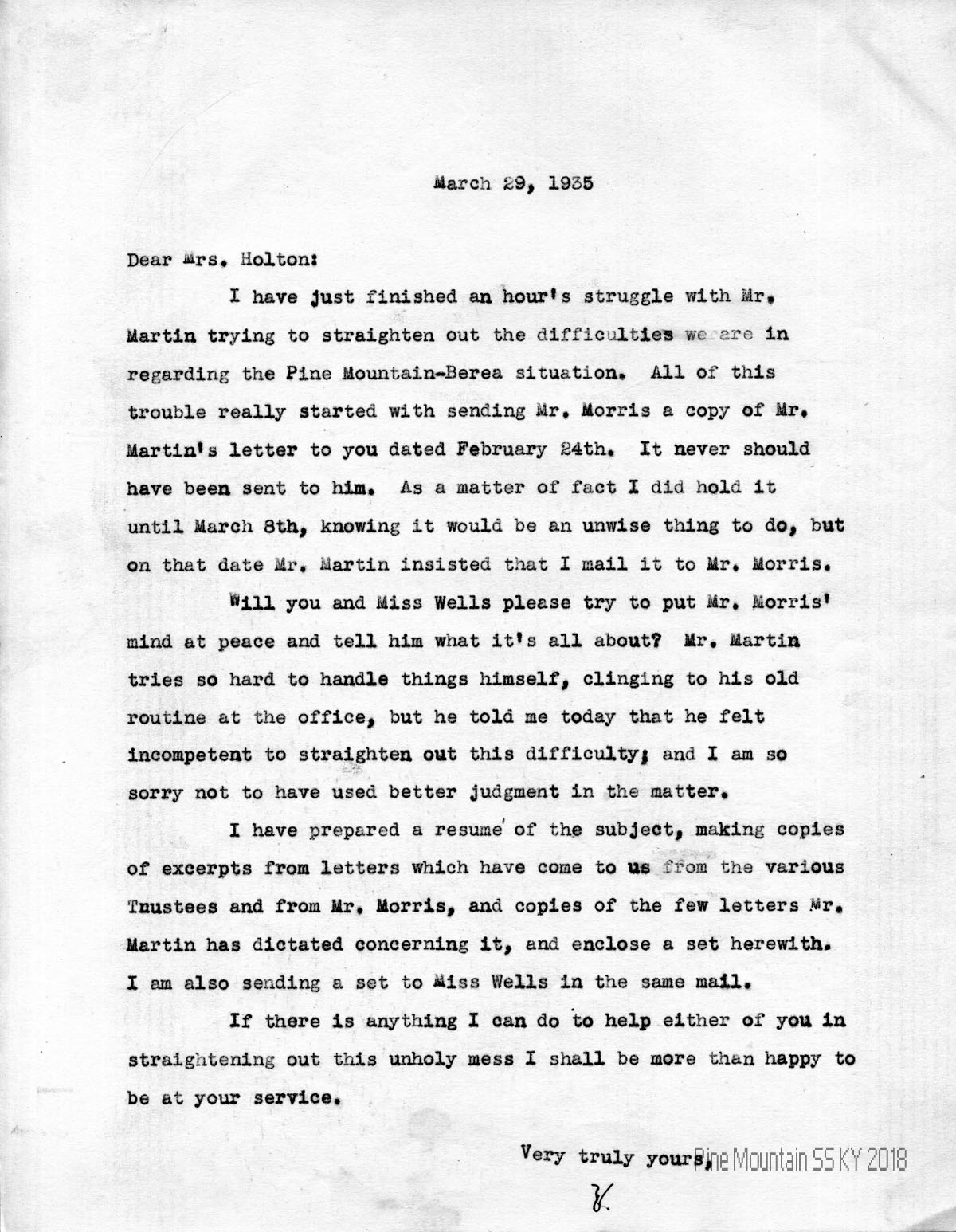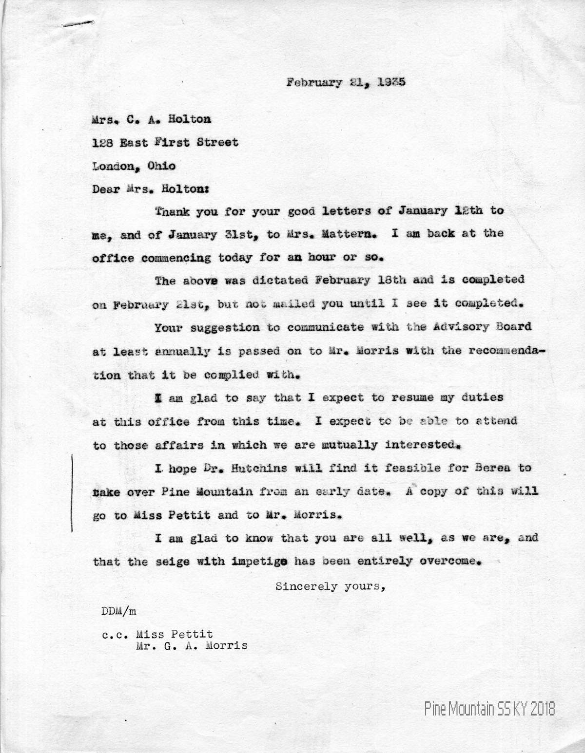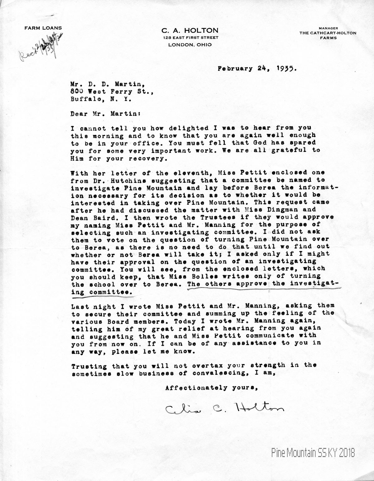 015 February 21, 1935, To Holton from [unsigned, D.D. Martin], cc: Pettit and Morris. “Your suggestion to communicate with the Advisory Board at least annually is passed on to Mr. Morris…. I hope Dr. Hutchins will find it feasible for Berea to take over Pine Mountain.”