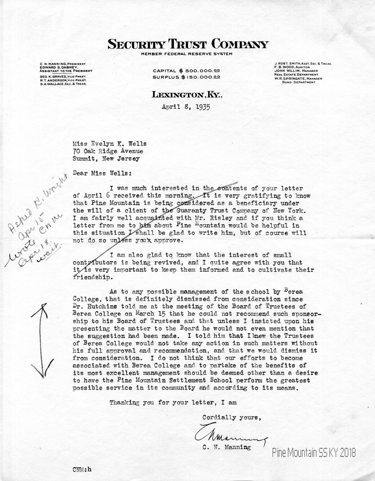 010 April 8, 1935. To Wells from C. N. Manning, President of Security Trust Company, Lexington, KY. He is gratified “to know that Pine Mountain is being considered as a beneficiary under the will of a client of Guaranty Trust Co. of NY, Mr. Risley, who Manning knows. He offers to send Risley a letter. He agrees that small contributors should be kept informed and cultivated. About Berea possibly managing PMSS, Dr. Hutchins told Manning during a March 15th Berea board meeting that “he could not recommend such sponsorship to his board of Trustees.” [Handwritten notation in left margin: “Asked K. Wright, Apr 15, wrote CNN Apr 18. Wait.’]