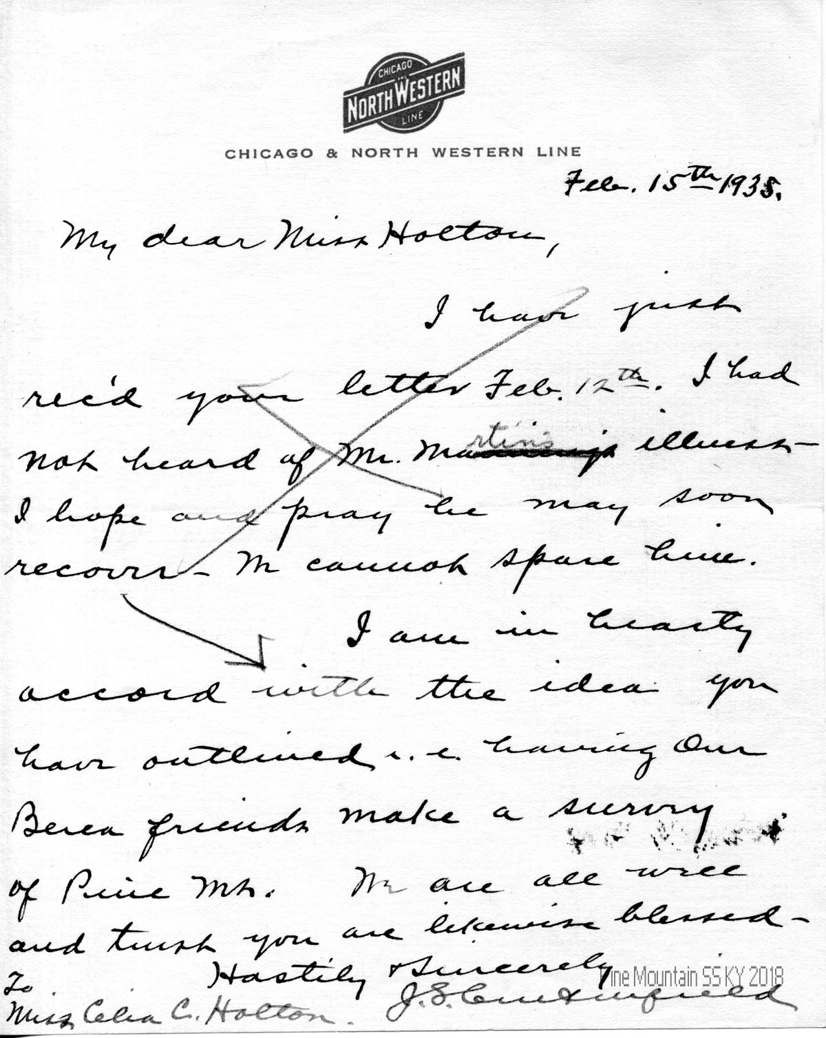 011 February 15, 1935. Handwritten letter to Holton from J.S. Crutchfield on letterhead for Chicago & North Western Line. He agrees to “having our Berea friends make a survey of Pine Mt.”