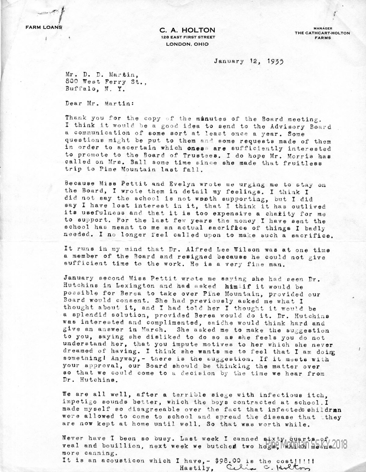 017 January 12, 1935. To Martin from Holton, suggesting that the Board communicate with the Advisory Board at least once a year. She mentions Mrs. Ball’s “fruitless trip” to PMSS. She writes that she has “lost interest in [the School], that I think it has outlived its usefulness and that it is too expensive a charity for me to support.” She recalls that Dr. Alfred Lee Wilson was once on the Board “and resigned because he could not give sufficient time to the work. He is a very fine man.” Holton tells of Miss Pettit’s letter saying she had seen Dr. Hutchins in Lexington and had asked him if it would be possible for Berea to take over Pine Mountain, provided our Board would consent.” Hutchins said he would “think hard and give an answer in March.” Pettit asked Holton to pass this information on to Martin. She describes an impetigo outbreak at the School.